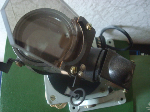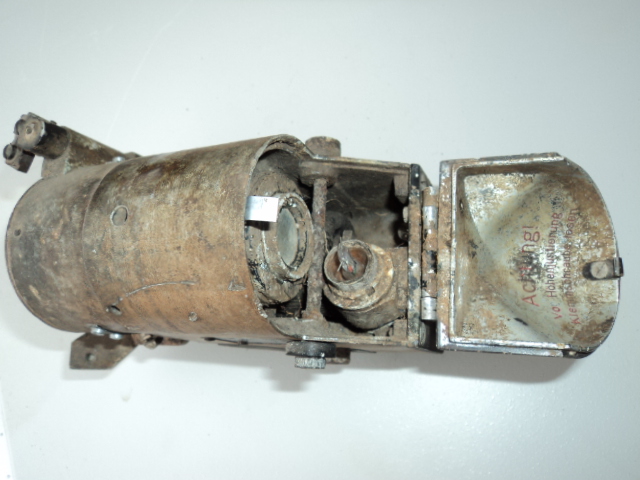 Найден в лесу у немецкого аэродрома. Размером с два кулака, оптика цела, видна сетка прицела. Однако непонятно: для чего применялась лампочка (на фото разбита), где использовался прицел...