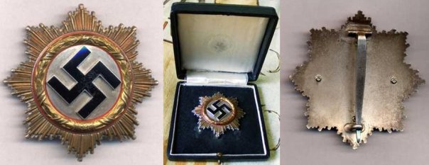 Германский Крест в Золоте (Deutsches Kreuz in Gold - DK-G), им награждались только за боевые заслуги. Для награждения Германским крестом в золоте необходимо было иметь Железный крест 1-ой степени. Германский Крест в Серебре (Deutsches Kreuz in Silber - DK-S), им награждались за заслуги, не связанные с непосредственным участием в боевых действиях. Для награждения необходимо было иметь Крест военных заслуг 1-ой степени. Награда имела форму восьмиконечной металлической звезды. В центре на белом фоне находилась чёрная свастика (покрытие эмаль), обрамлённая лавровым венком. Германский Крест в Золоте и Серебре внешне идентичны, единственным исключением, являлся венок листьев лавра, с цифрами 1941. (В случае с Золотым Германским Крестом, венок имеет золотое покрытие.) Размеры награды равно как и цвет эмали свастики с годами претерпевали изменения, в основном диаметр в самом широком месте варьировался от 62,5 до 63.5 мм. Ранние экземпляры изготовлялись из томпака, затем из купаля (сплав 99,95% алюминия и 0,05% меди). Награда была самой сложной в изготовлении и состояла из 5 составных частей. Задник крепился на заклепках (как полых, так и цельных), колличество которых было различным. Крепился на широкой застежке, изделия на винте следует относить к фальшивкам, так как коммерческое изготовление ордена, равно как и большинства остальных наград было строжайше запрещено в 1941 году, то есть до начала производства ордена. Крест носился по центру правого нагрудного кармана мундира. Если карманов на кителе не было (например у кригсмарин), то крест был приколот на правой стороне груди на расстоянии 15 см. ниже эмблемы войск. В очень редком случае награждения двумя разновидностями, носилась только золотая степень. На каждой награде имелось клеймо фирмы изготовителя (на булавке, или реверсе ордена). Германский Крест имел достаточно крупный для награды размер и был достаточно тяжёл. Его было неудобно носить на форме военнослужащим на подводных лодках и пилотам самолётов, кабины и отсеки которых имели весьма небольшие размеры. В результате 5-ого июня 1942 г. была учреждена версия награды выполненная из ткани, качество изготовления которой было весьма высоко. Версия Золотого Германского креста имела три основные разновидности в цветовых тонах формы. для Вермахта и Waffen SS - поле награды серое для Люфтваффе - сине-серое для танковых войск и Кригсмарине - чёрное Германский Крест крепился на заколке, на правой стороне мундира под нагрудным карманом. Всего Золотым Германским крестом было награждено: DK-G DK-S В Вермахте 14639 874 В Люфтваффе 7248 65 В Кригсмарине 1481 105 В СС и полиции 822 702