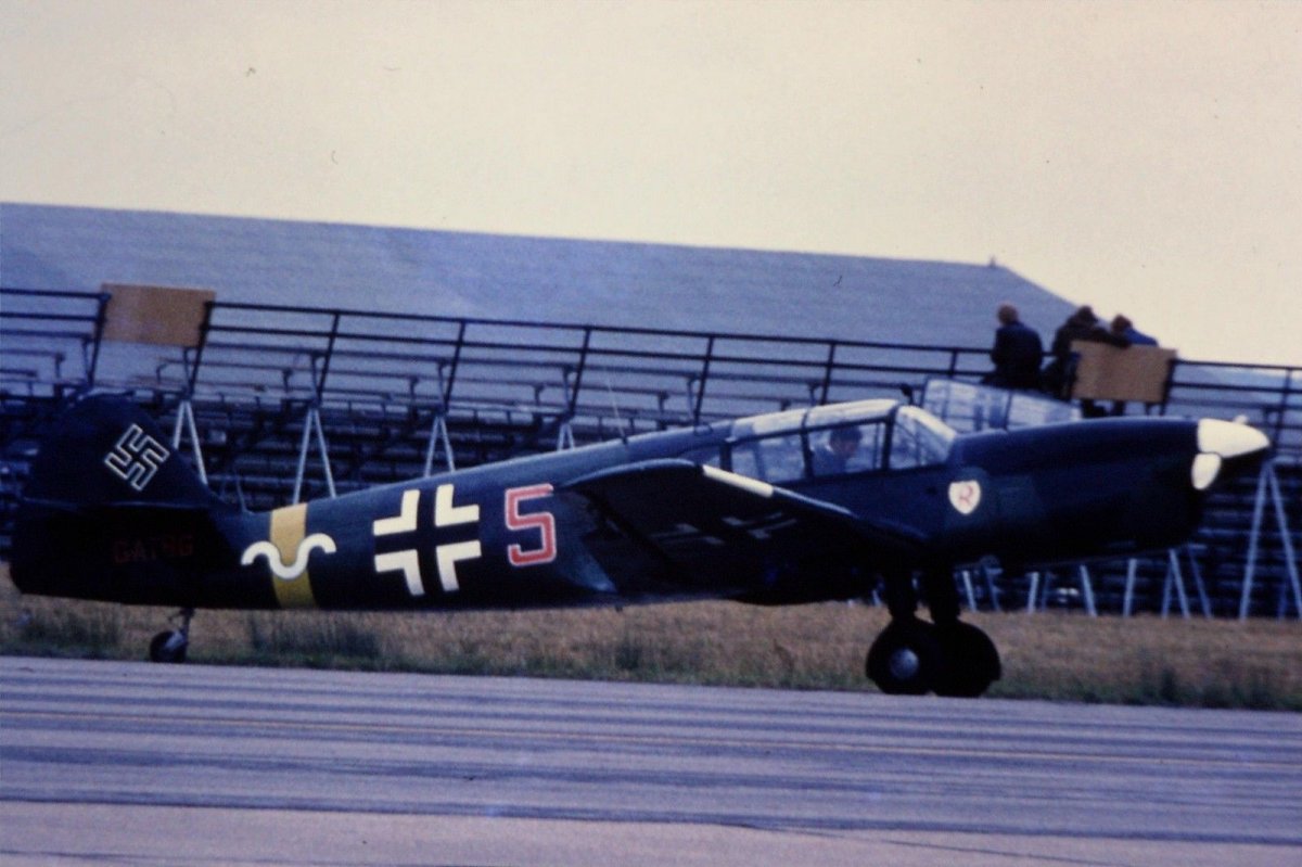 1) Battle of Britain is a 1969 British Second World War film directed by Guy Hamilton, and produced by Harry Saltzman and S. Benjamin Fisz. The film broadly relates the events of the Battle of Britain. The script by James Kennaway and Wilfred Greatorex was based on the book The Narrow Margin by Derek Wood and Derek Dempster. 2) Buchon/Messerschmitt 109s can be seen in this shot taken at El Corpero Airfield, Spain, in the spring of 1968. (Photo from the Brian Williams collection, text from Robert J. Rudhall's "Battle of Britain Film - The Photo Album") 3) Hammish Mahaddie, the film's Chief Technical Advisor, stands by one of the "Messerschmitt 109's" while a colleague inspects the cockpit. (Photo from Donald MaCarron, text from Robert J. Rudhall's "Battle of Britain Film - The Photo Album") 4) To get the Rolls-Royce Merlin engine into the Messerschmitt 109 airframe was a real 'shoehorn' job, as can be seen from this uncowled run-up shot. (Photo from Peter Sargent, text from Robert J. Rudhall's book "Battle of Britain Film - The Movie")