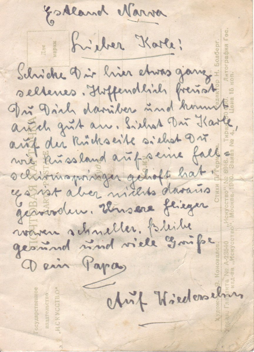 Эстония Нарва Дорогой Карле. Посылаю тебе здесь кое-что очень редкое. Надеюсь ты будешь рад этому и оно прибудет в целости и сохранности. Посмотри себе эту карточку, на обратной стороне посмотри как Россия надеялась на своих парашютистов. Да, но из этого ничего не вышло. Наши лётчики были быстрее. Оставайся здоровым, с многими приветами твой папа. До свидания. --------- перевод: dad