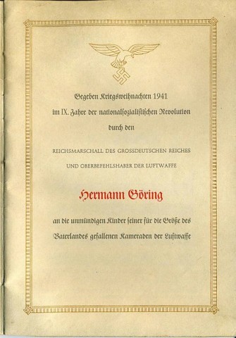 "Выдана в Рождество 1941 года, в честь 9-ти летия национал-социалистической Революции Рейхсмаршалом великого немецкого рейха и главнокомандующим Люфтваффе Германом Герингом, маленьким детям наших павших за великое отечество товарищей по Люфтваффе".
