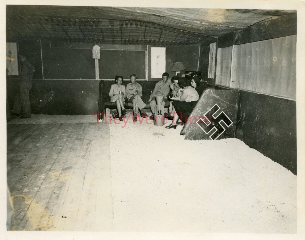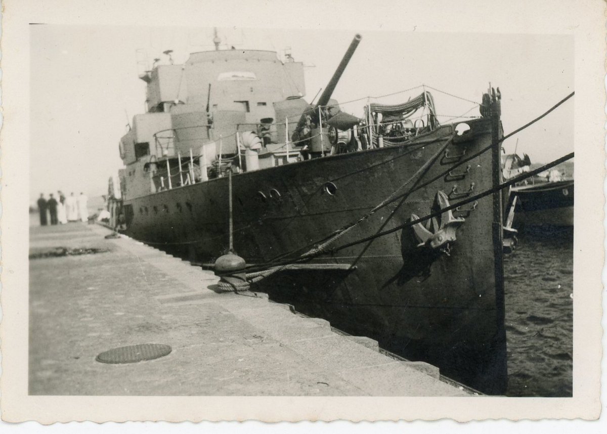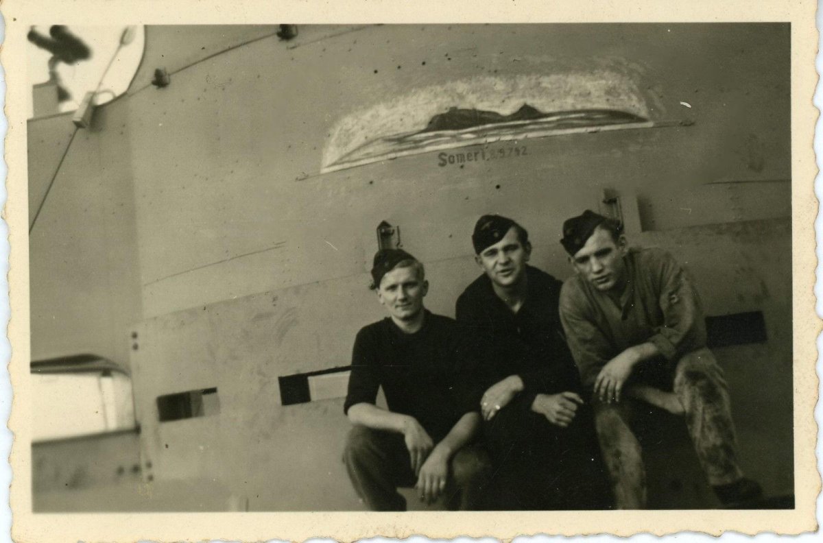 Члены экипажа немецкого тендера Nettelbeck на фоне рисунка на надстройке корабля в честь победы немецко-финских союзников у Соммерса 8-9 июня 1942 года.
