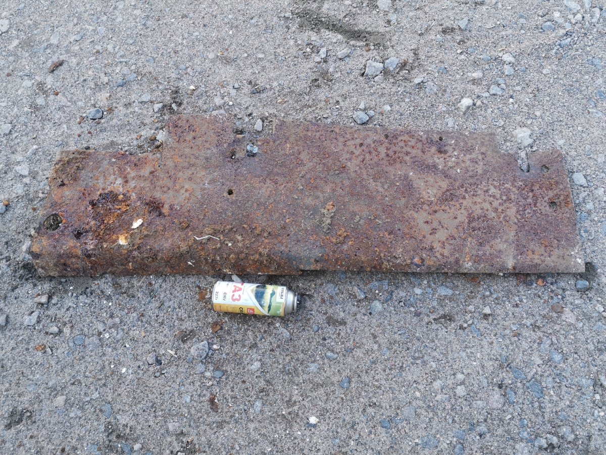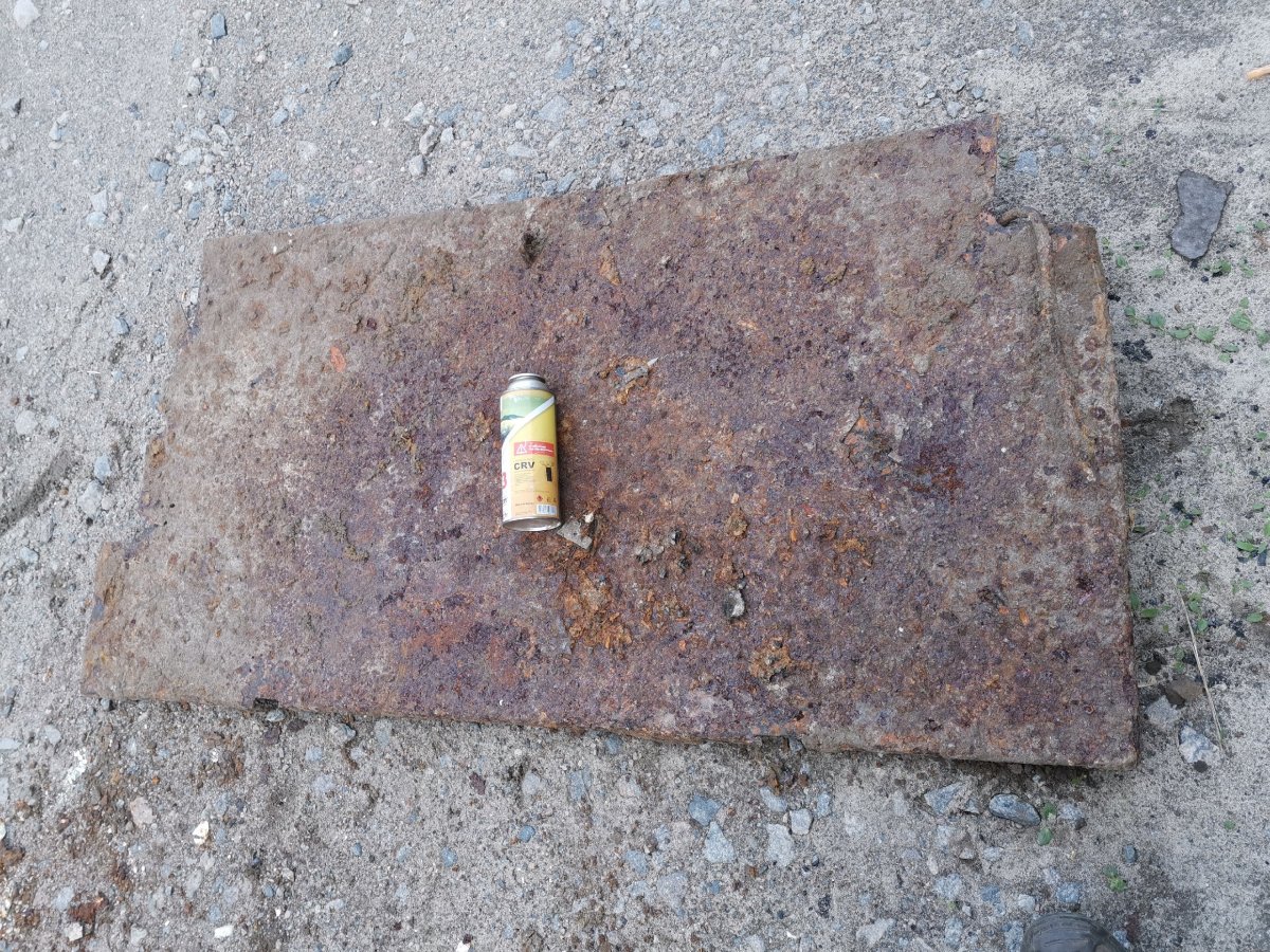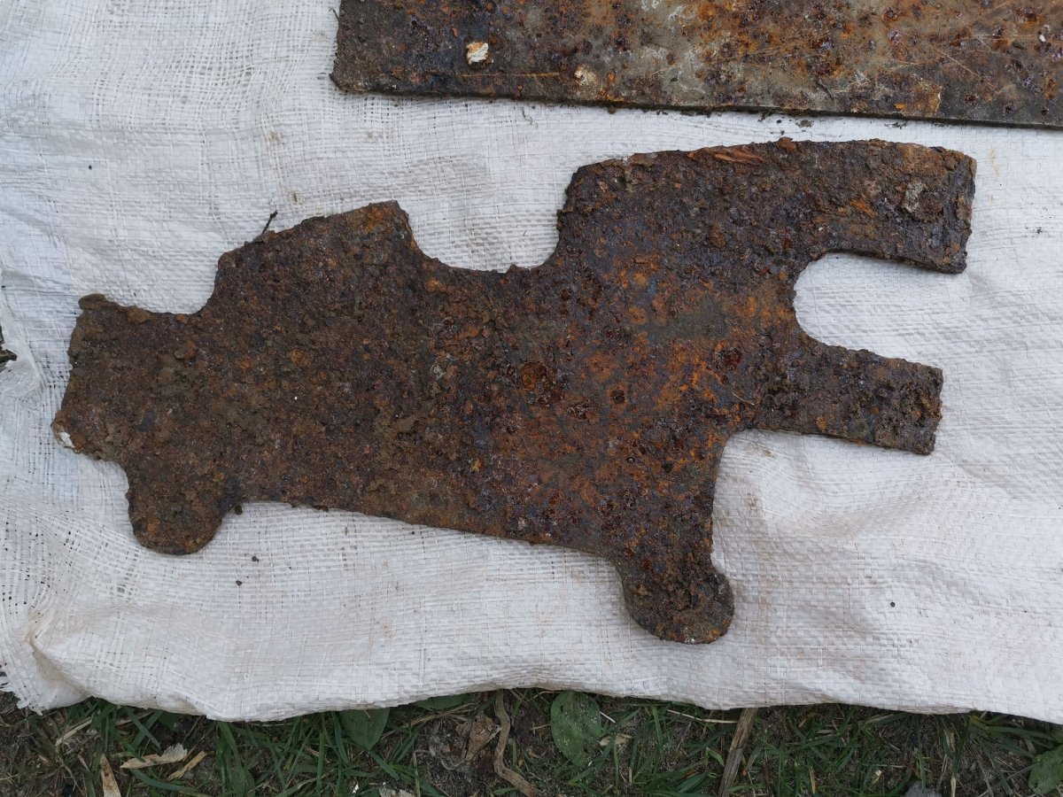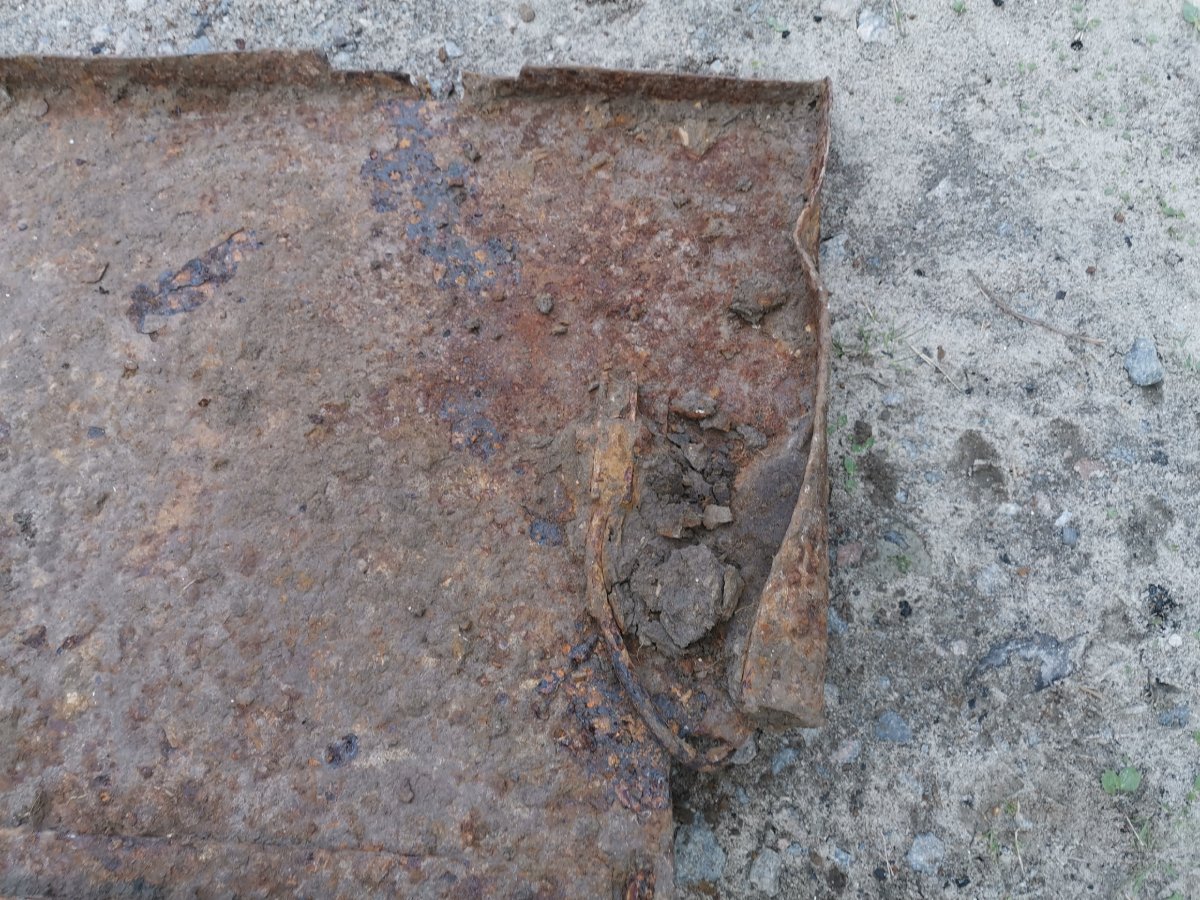 Борт(дверь)? Толщина около 3-4мм есть две завесы-упора, в одном сохранился прут распорка. С другой стороны есть петля. Из этого листа начинали что то вырубать из за этого он несеметричен.