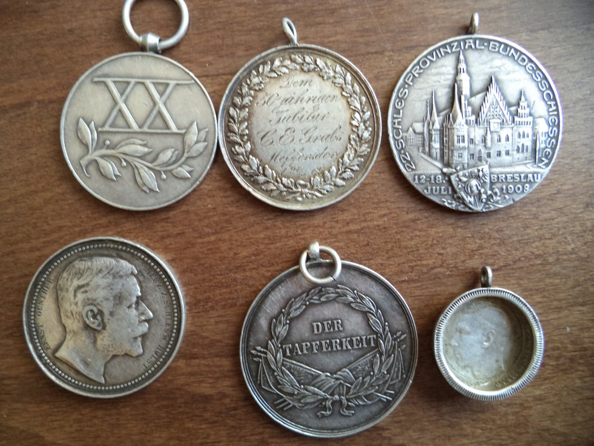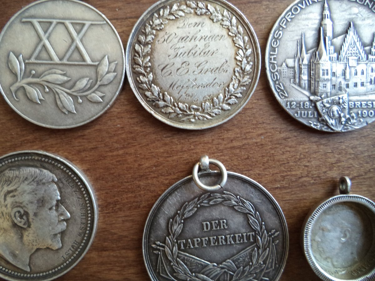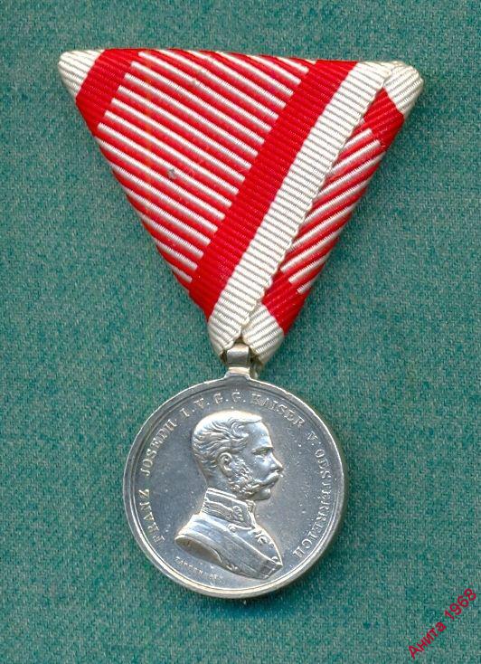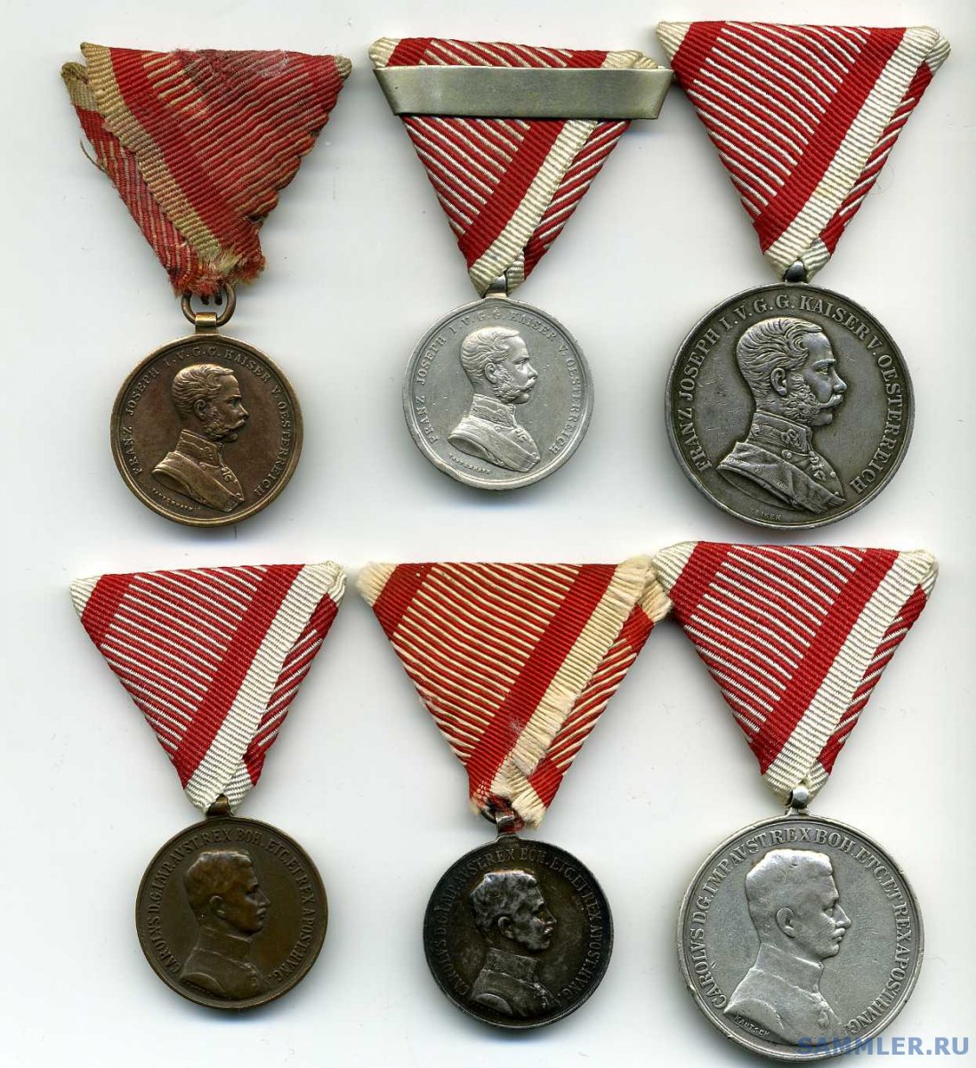 1. Медаль с орлом - польская, За долголетнюю службу 2 класса. http://www.awardrp.ru/1918_1939/m_dolg_sl.htm http://www.liverpoolmedals.com/Army-Long-service-medal-20-years-silver-hallmarked-on-edge.html 5. Медаль - Австро-Венгрия, серебряная медаль "За храбрость", http://ah.milua.org/medal-za-xrabrost http://www.sammler.ru/index.php?showtopic=24665 https://reibert.info/threads/medali-za-xrabrost-avstro-vengrija-pmv-v-serebre.127131/ "Дизайн аверса «Медали За Храбрость» представляет собой профильный портрет правящего императора. Смена императоров, изменение на аверсе медали легенд и подписей медальеров, резавших штемпели медалей, привело к большому числу разновидностей. Так, например, только портрет императора Франца-Иосифа I трижды кардинально изменялся — от юношеского до зрелого возраста (но всегда в обмундировании фельдмаршала. При этом вокруг портрета императора с 1849 года был текст «Франц Иосиф І Император Австрии» (FRANZ JOSEPH I. KAISER VON OESTERREICH), а с 1859 и до последних дней его правления: «Франц Иосиф I милостью Божией Император Австрии» (FRANZ JOSEPH I V.G.G. KAISER V. OESTERREICH). На реверсе помещались шесть перекрещенных флагов в окружении венка и надпись «За Храбрость» (DER TAPFERKEIT).
