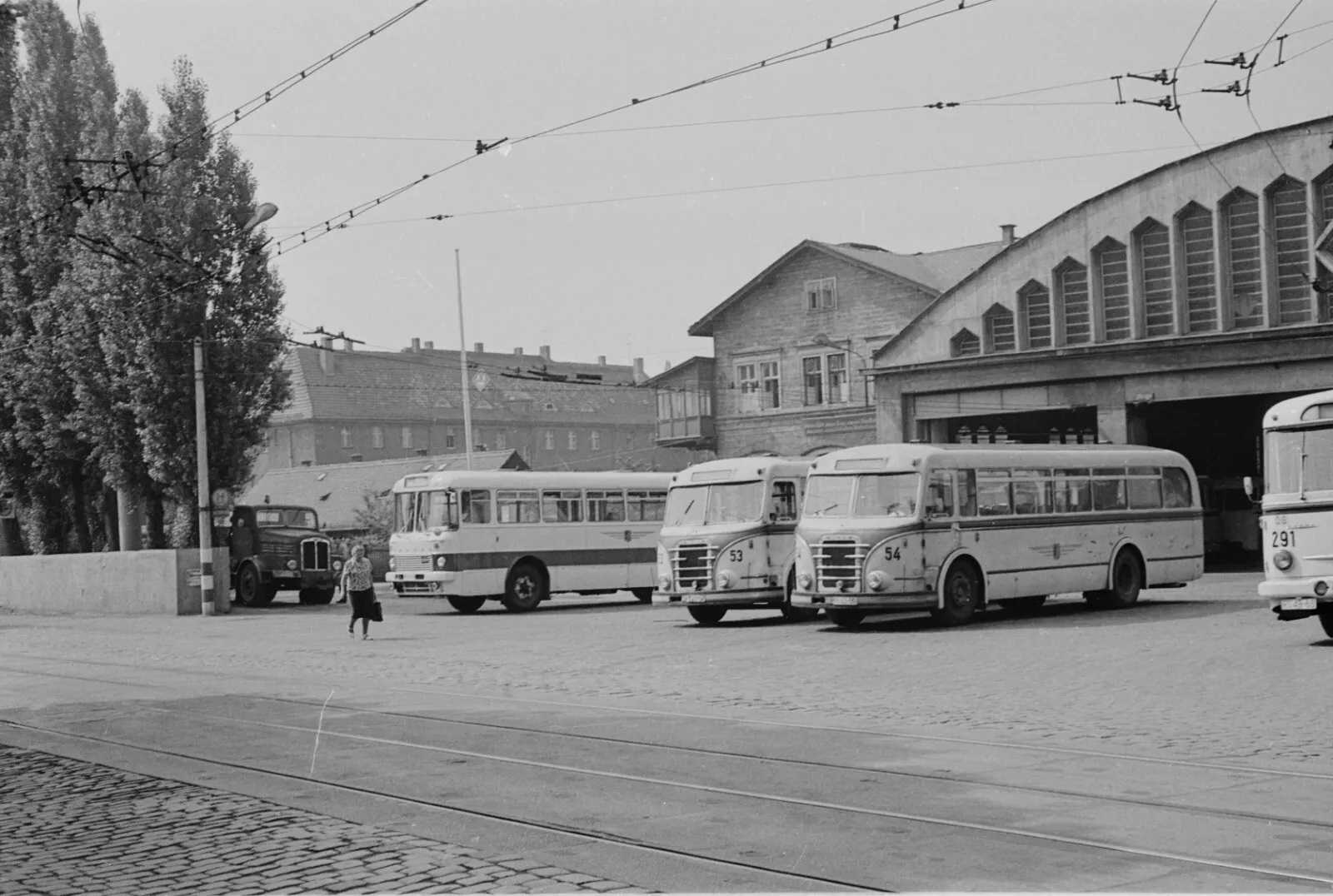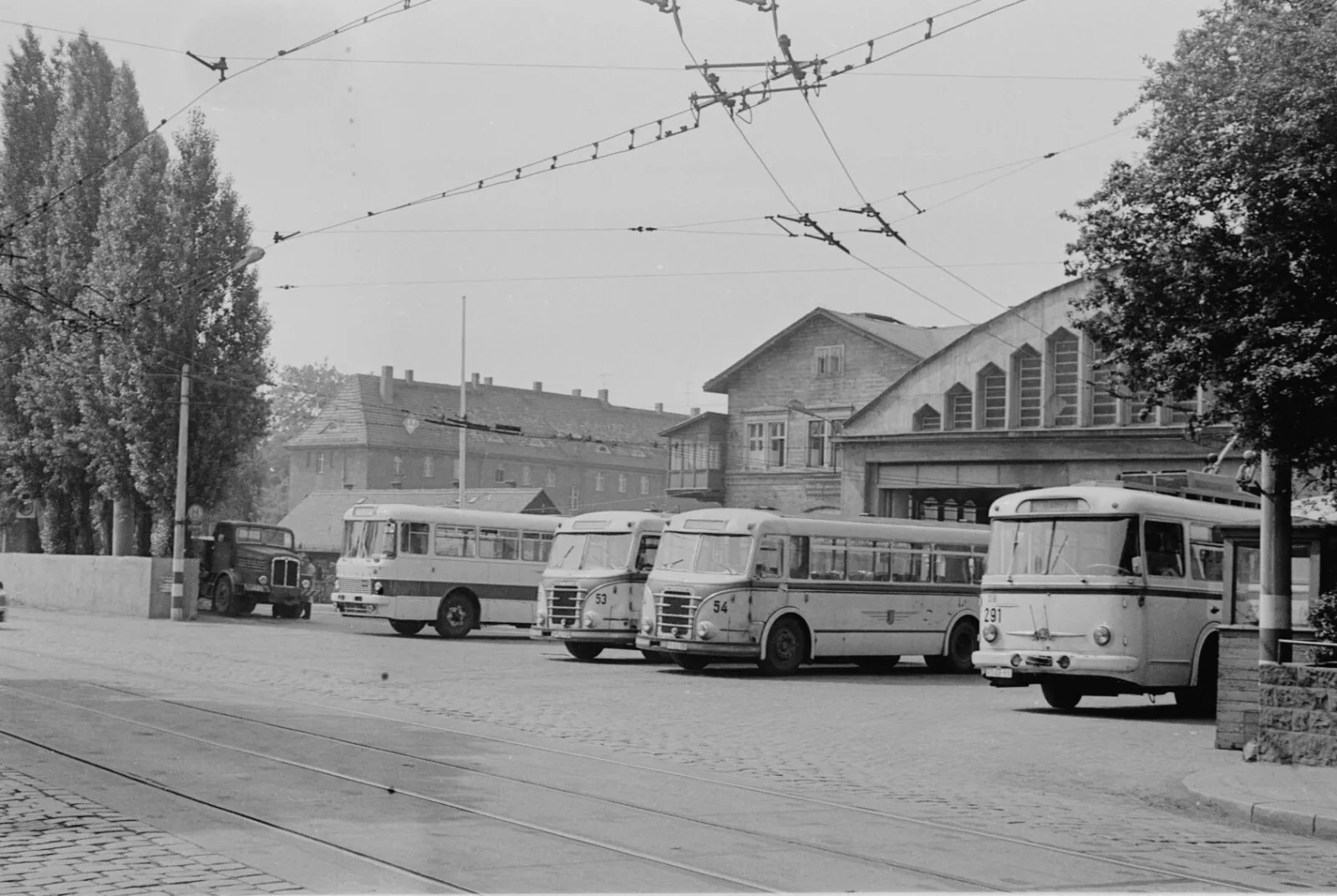 1) DDR - Gelenkbusse "Ikarus 180" im Depot - 70iger Jahre 2-4) DDR - Blick in Straßenbahnhof Blasewitz - 70iger Jahre