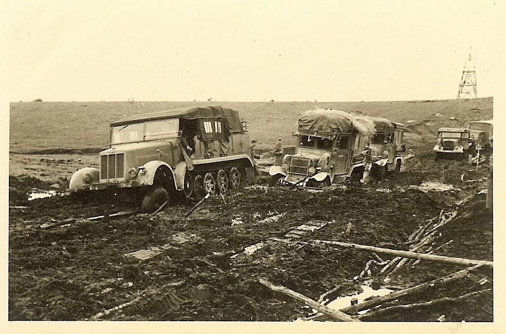1) Soldaten der Stell.Beob.Abt.58 auf Knüppeldamm "Russenweg" am Wolchow im Raum "Spassaya Polyce" (?) nordlich Weliki Nowgorod, Russland, 1943. Namen + "Fahrt nach Spassaya Polyce zum Angriff der Letten am 2.9.43"