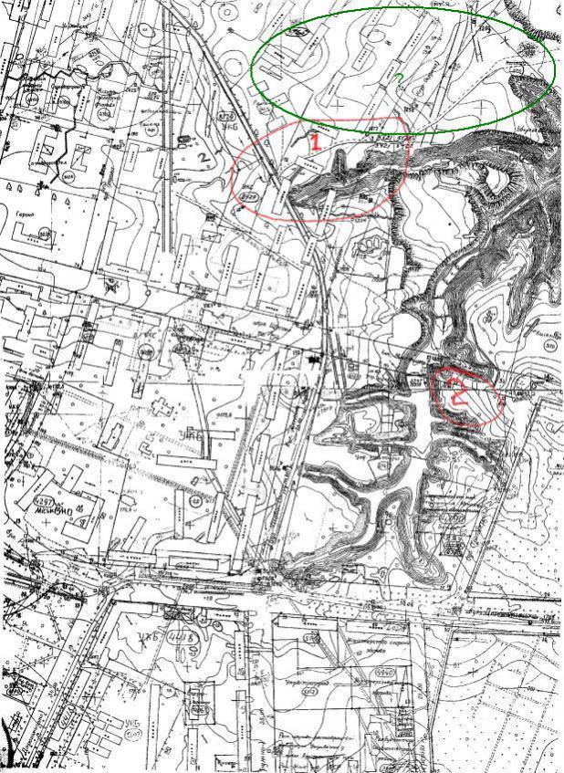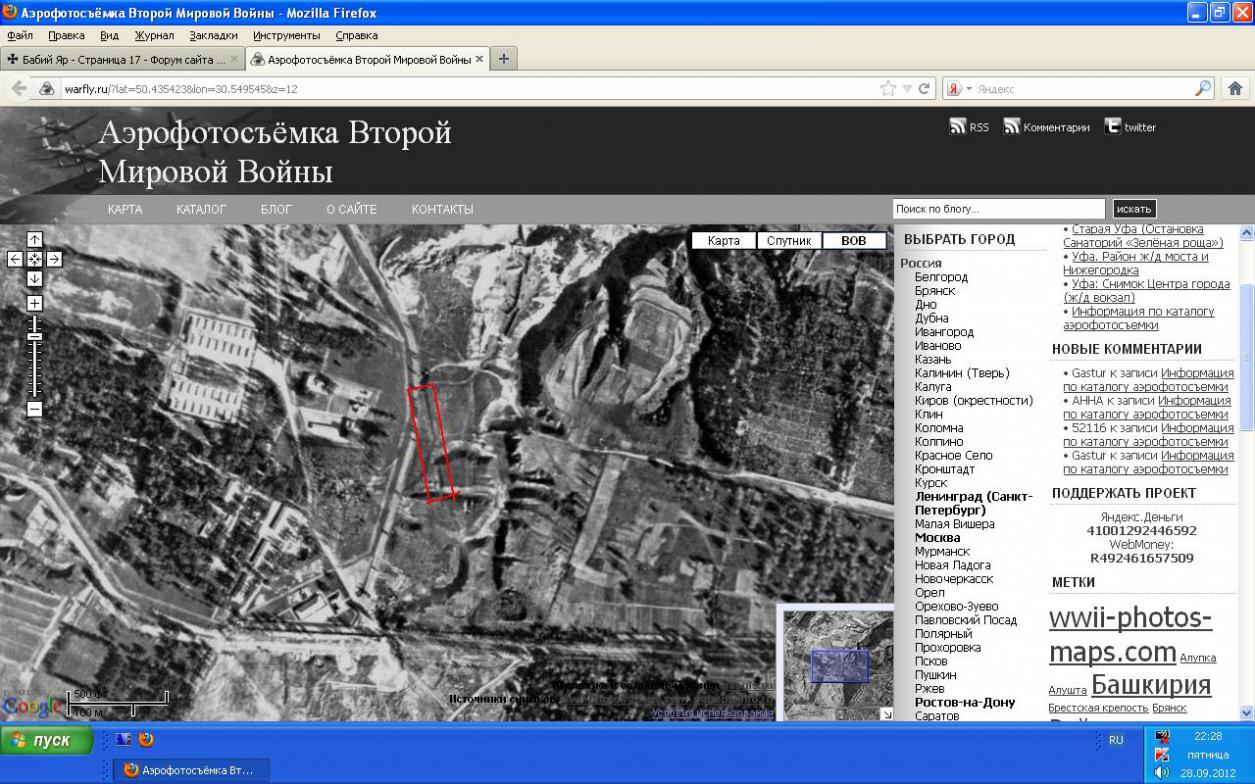 Своего мнения никому не навязываю, но останусь при своих убеждениях. Если принять Вашу версию, то приблизительно в месте обведённом зелёным должна быть большая группа деревьев. Но фото 43-го показывает, что там пустырь. Почему? А куда денем главный и неизменный ориентир - общее понижение ландшафта? Оно (читайте - Днепр) на фото справа.
