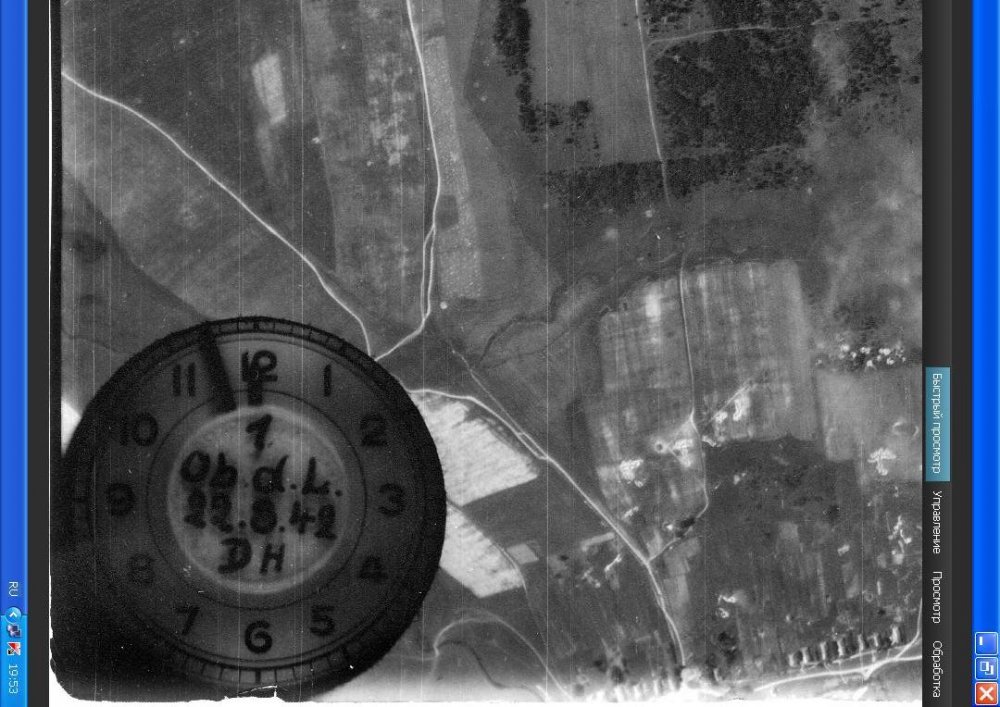 Да, действительно - снимки 1943 года. Снимки сделаны с большой высоты и выложены в и-нет в оооочень облегченном виде. На этих снимках невидно вообще ничего. Какие вы там следы событий в Бабьем Яру хотели рассмотреть??? Вы можете показать на этих снимках хотя-бы различимую траншею??? Кстати, вот кусок низковысотного снимка масштаба 1:25000 района Можайска в августе 1942 года. Можайск в этот период - глубокий советский тыл. Немцы постоянно делали съемку нашей территории с любой высоты.