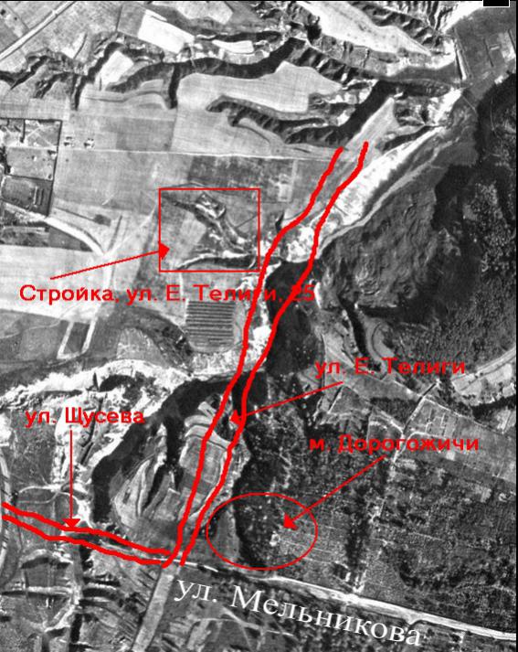Наконец-то мне попались в руки исходные файлы аэтофотосьемки Яра 1943г. Думаю, на этом фото даже люди с оч-ч-ч-ень ослабленным зрением увидят степень разрытости Яра на местах массовых расстрелов. Для сравнения в верхней части кадра оставил нетронутые овраги (ориентировочно, они проходили севернее нынешней ул. Ольжича). Разница всем заметна?