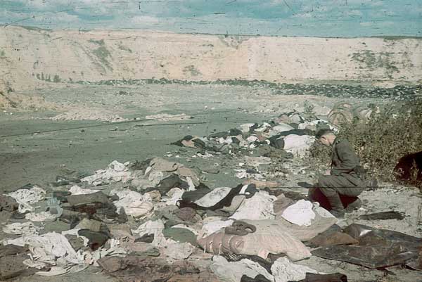 все классно. Но на фото с эсэсивцямы я чтото не увидел отцепления территории. И вообще толком охраны. А где же пресловутая колючки и т.д.? Лично я вижу пленных с какойто целью копающий что то. Например землянки себе. Или еще какието работы по ландшафтному дизайну) Никаких ям не вижу. Да и привязки особо тоже. Допустим даже что это вообще Умань например или еще чтото. Ну чисто гипотетически. Да и дорога на которой бабульки стоят где это место вообще? Дорогая пересекающая яр . Плюс на фото сильно разные берега яра. Отличие конкретное. И тоже никакой охраны.
