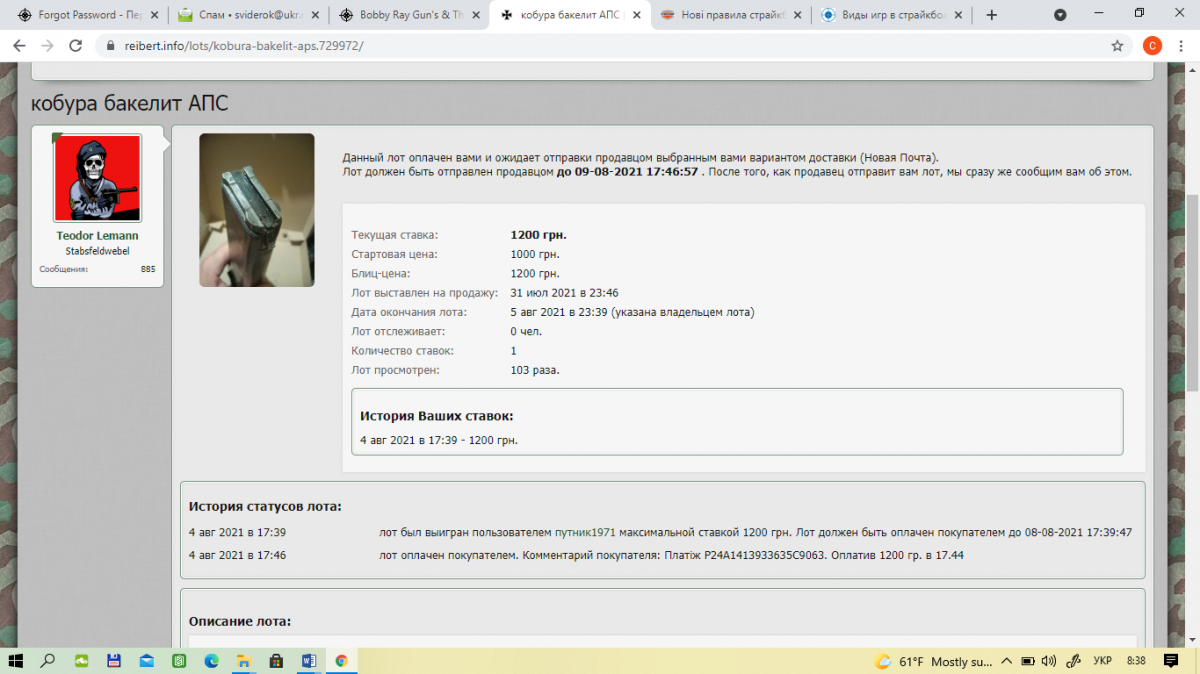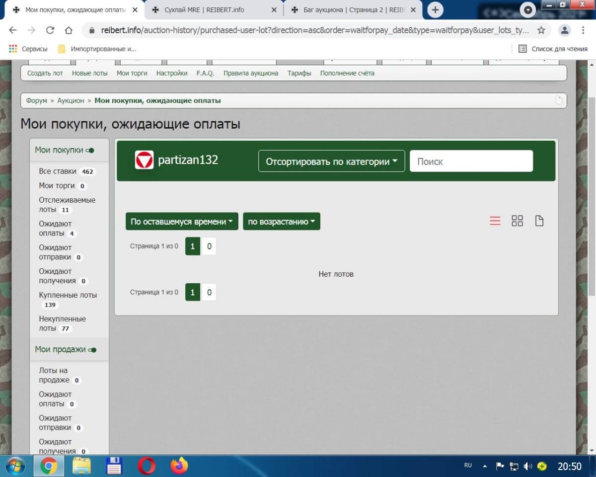 Приветствую! Если на аукционе купили, то тут должна появится запись https://reibert.info/auction-history/purchases?completed=1&status=send https://reibert.info/auction-history/purchases?completed=1&status=take&version=new А на отправку ,Продавцу даётся 5 дней, после Вашей оплаты и отметки в лоте "Оплатил"
