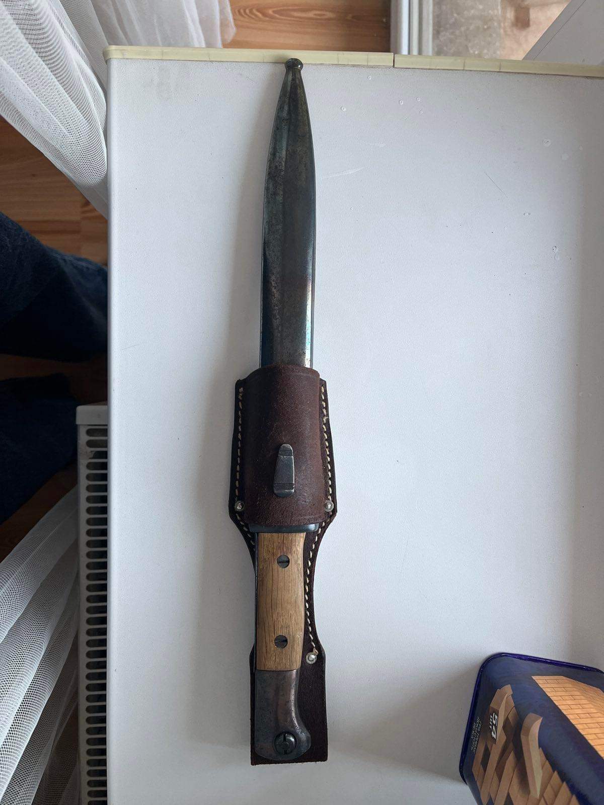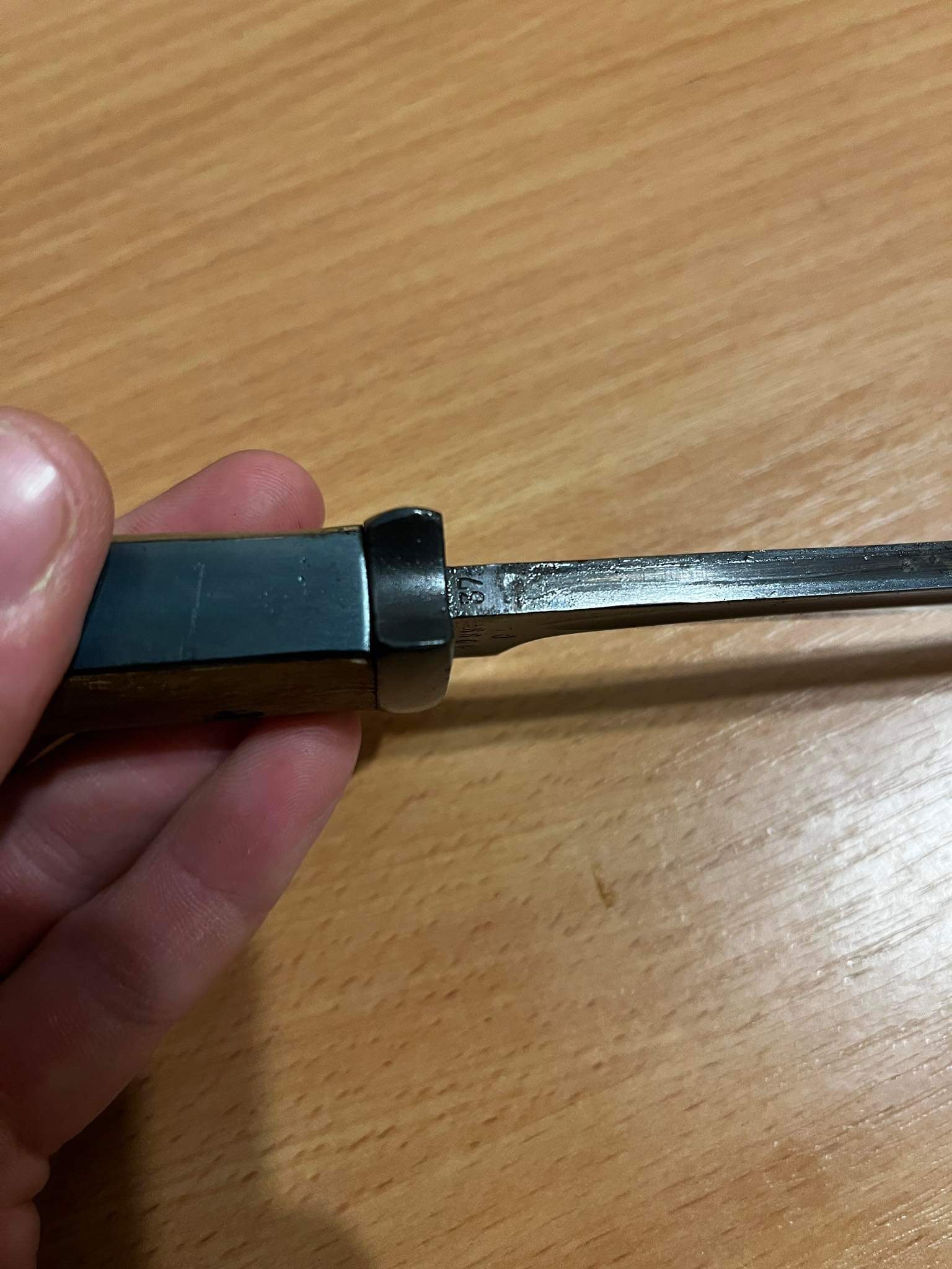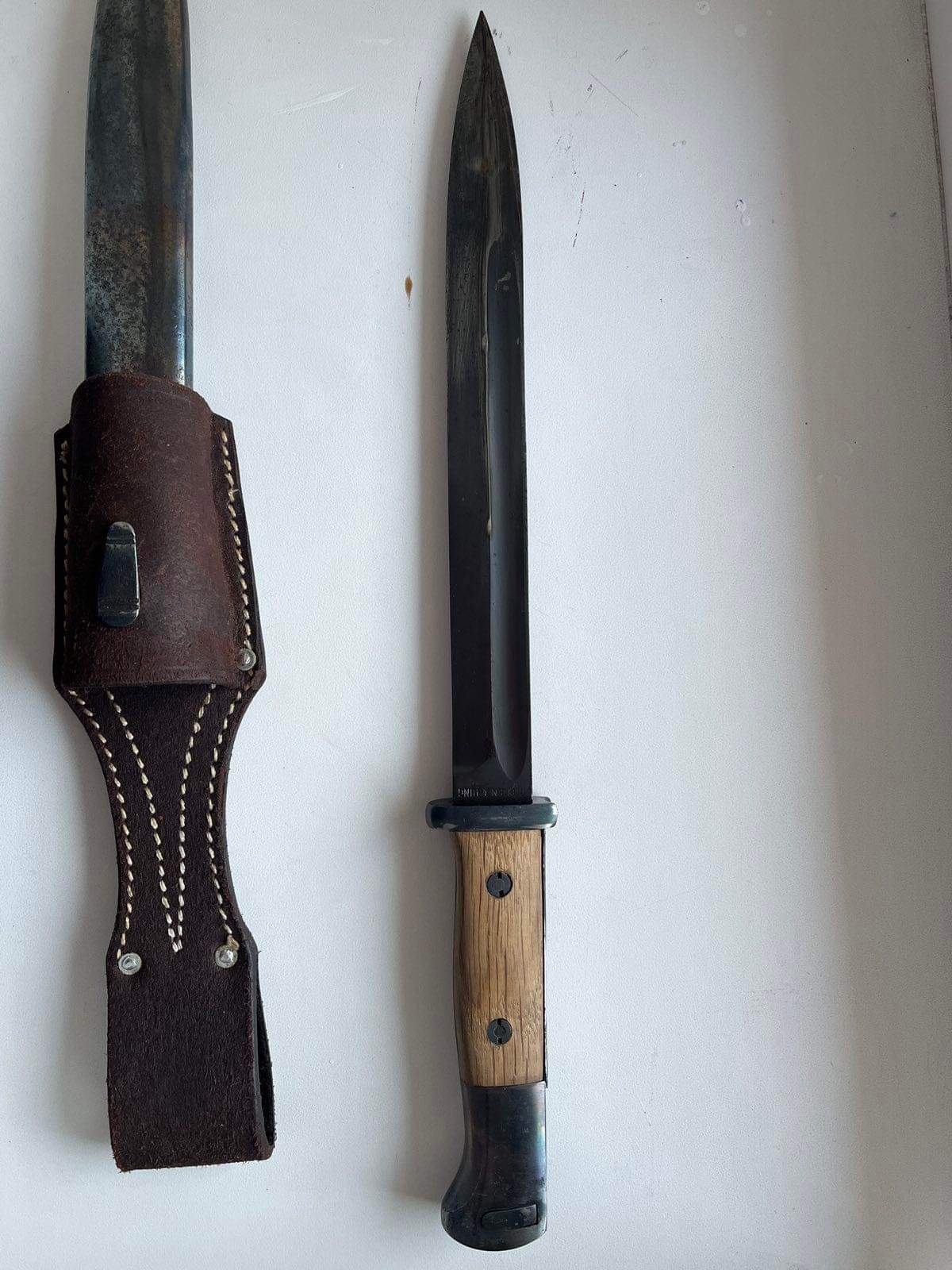Чердачний штик. Лезо залишили як воно збереглося, це єдина його частина, яка має гарний сохран. Ручку шліфували і переворонили. Як і ножни. Дерево і вогнеупорна пластина новоробні. Я думаю в районі 5000 гривень. Недавно "Еліт Дімант " пішов більше 15 000 гривень. Але там виробник зіграв роль, плюс стан був дуже гарний у рідній комплектації. І рідна оригінальна жаба була.