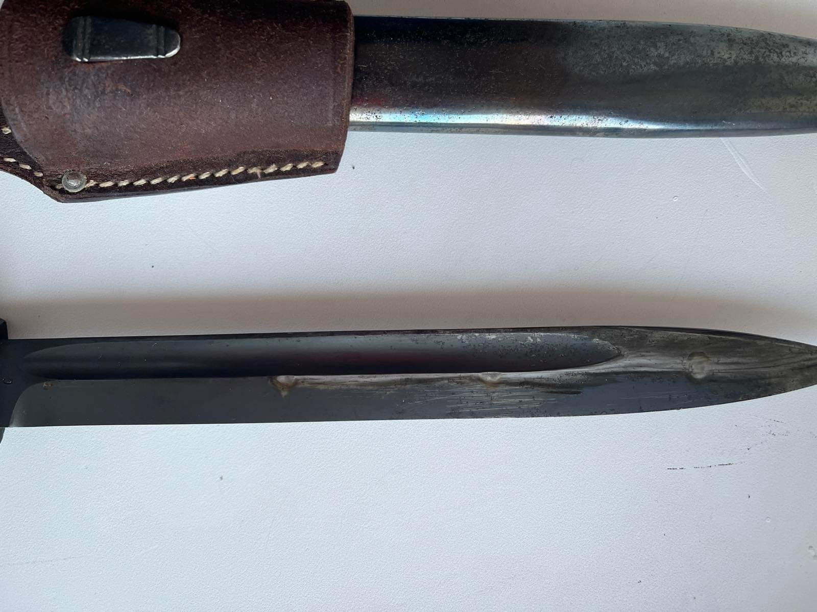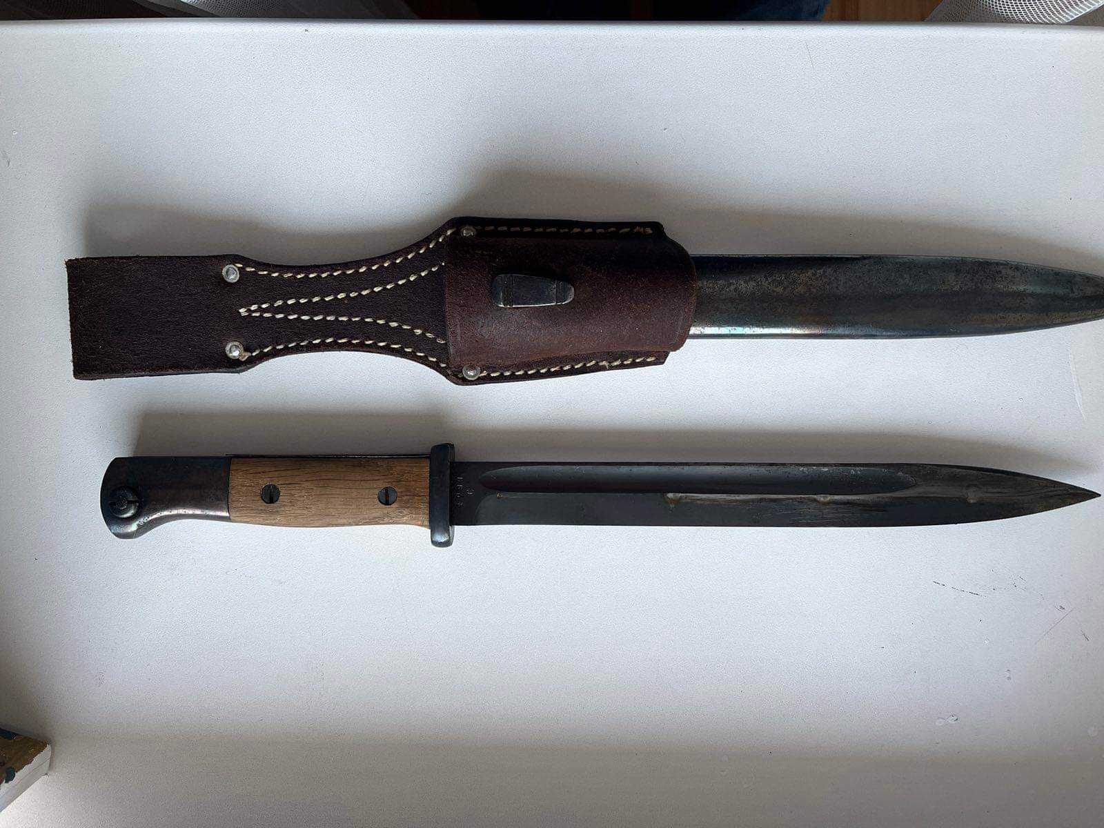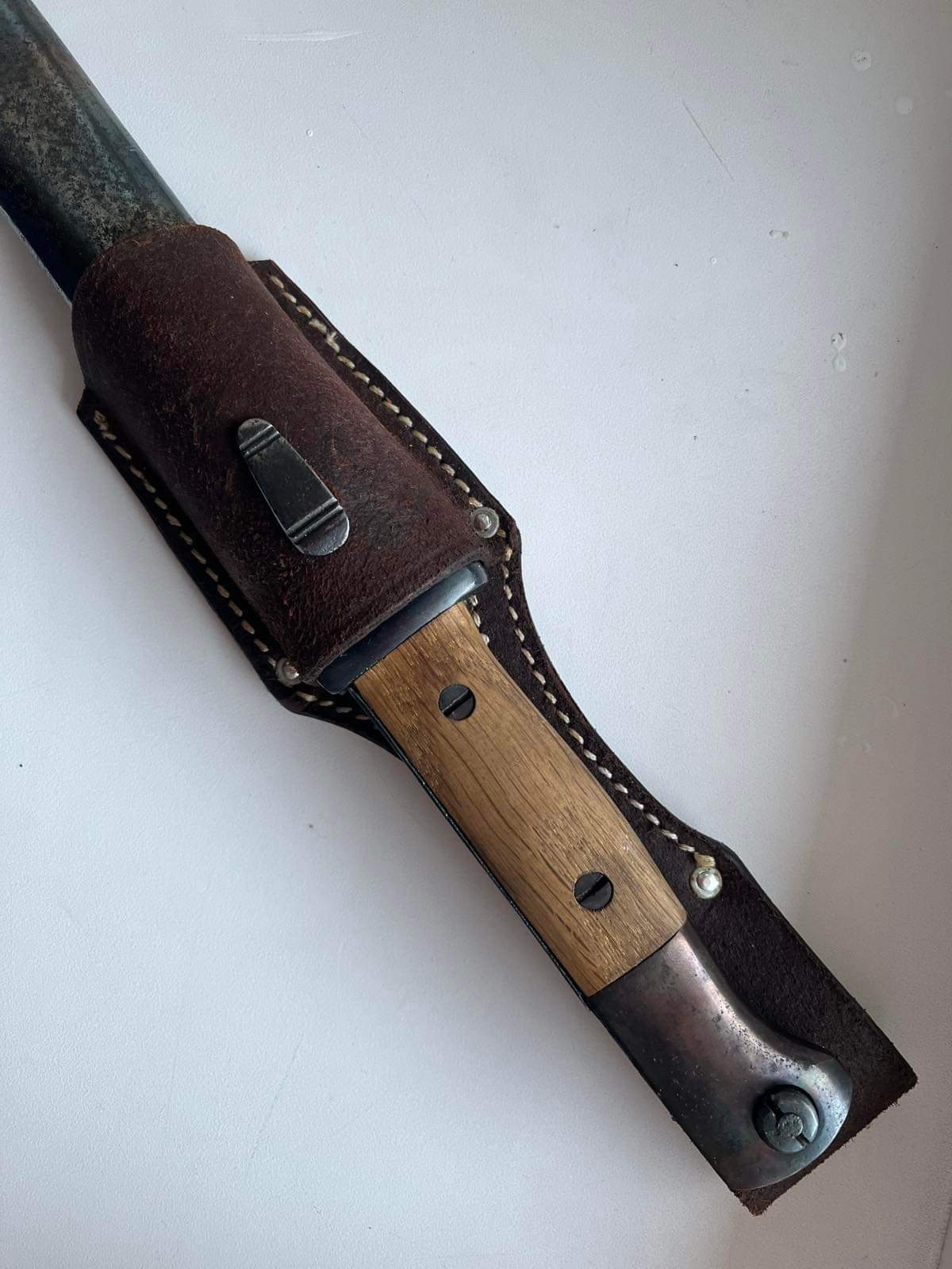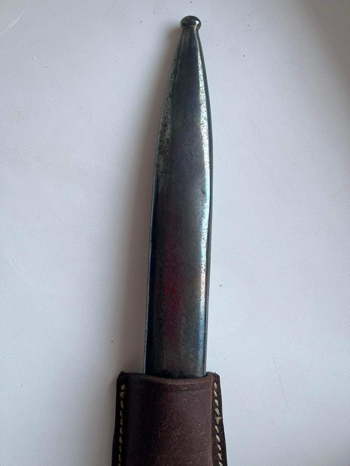 Чердачний штик. Лезо залишили як воно збереглося, це єдина його частина, яка має гарний сохран. Ручку шліфували і переворонили. Як і ножни. Дерево і вогнеупорна пластина новоробні. Я думаю в районі 5000 гривень. Недавно "Еліт Дімант " пішов більше 15 000 гривень. Але там виробник зіграв роль, плюс стан був дуже гарний у рідній комплектації. І рідна оригінальна жаба була.