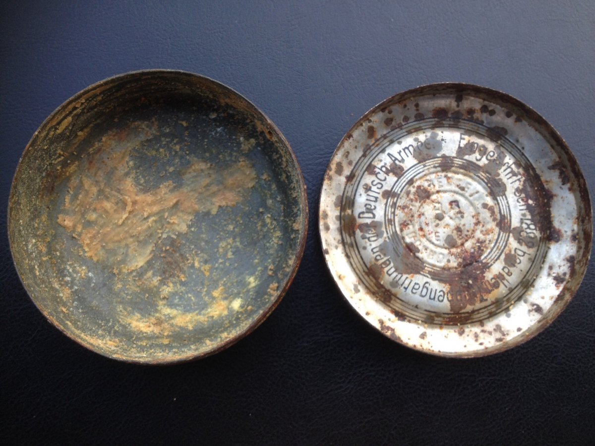 Приветствую! Вот попалась такая банка. Вроде от обувного крема. Но не уверен. Верх цинковый, низ стальной. Диаметр 65 мм. Заранее спасибо всем ответившим. Внутри это не окислы, а остатки того что было, на ощупь жир.