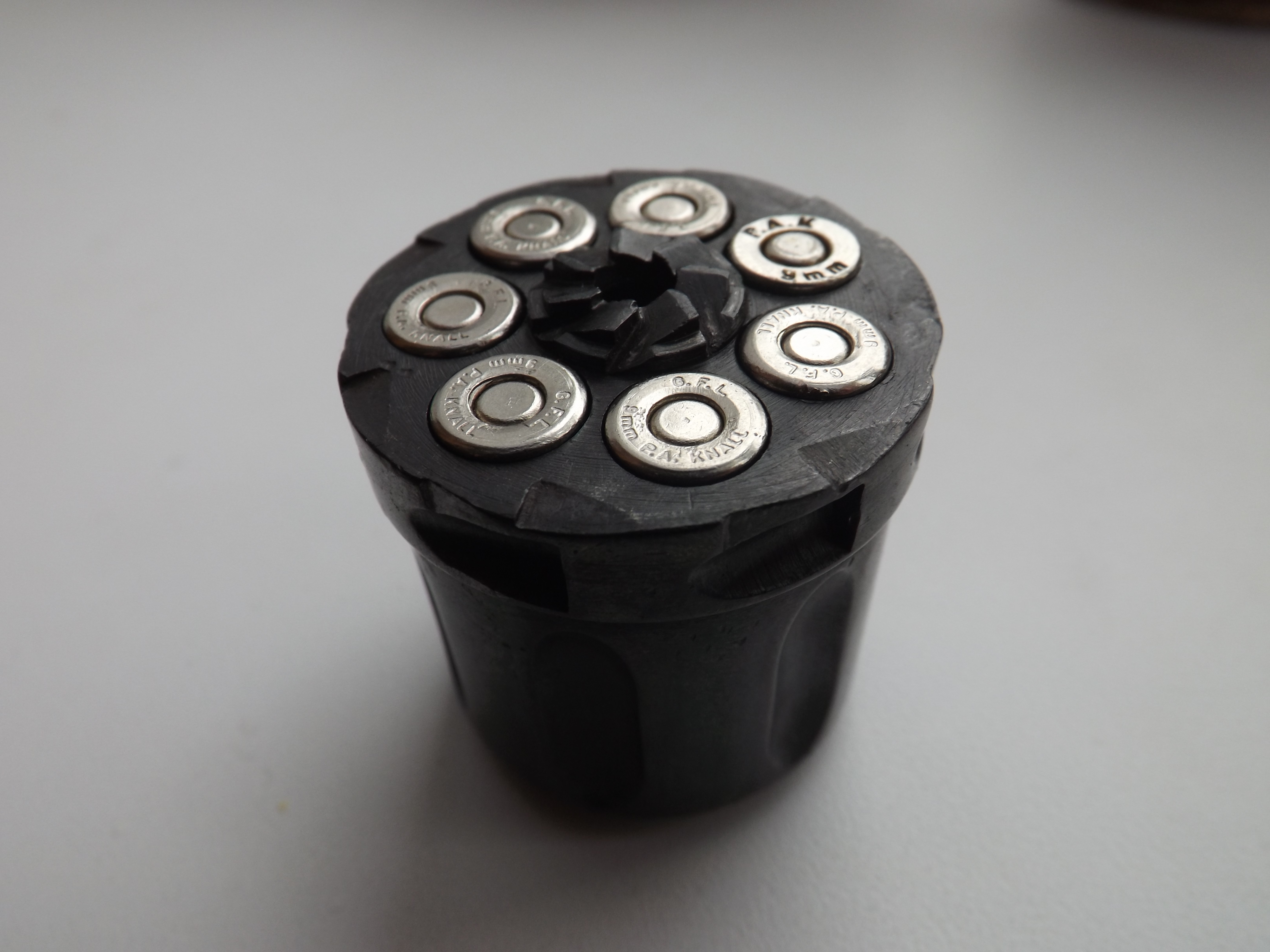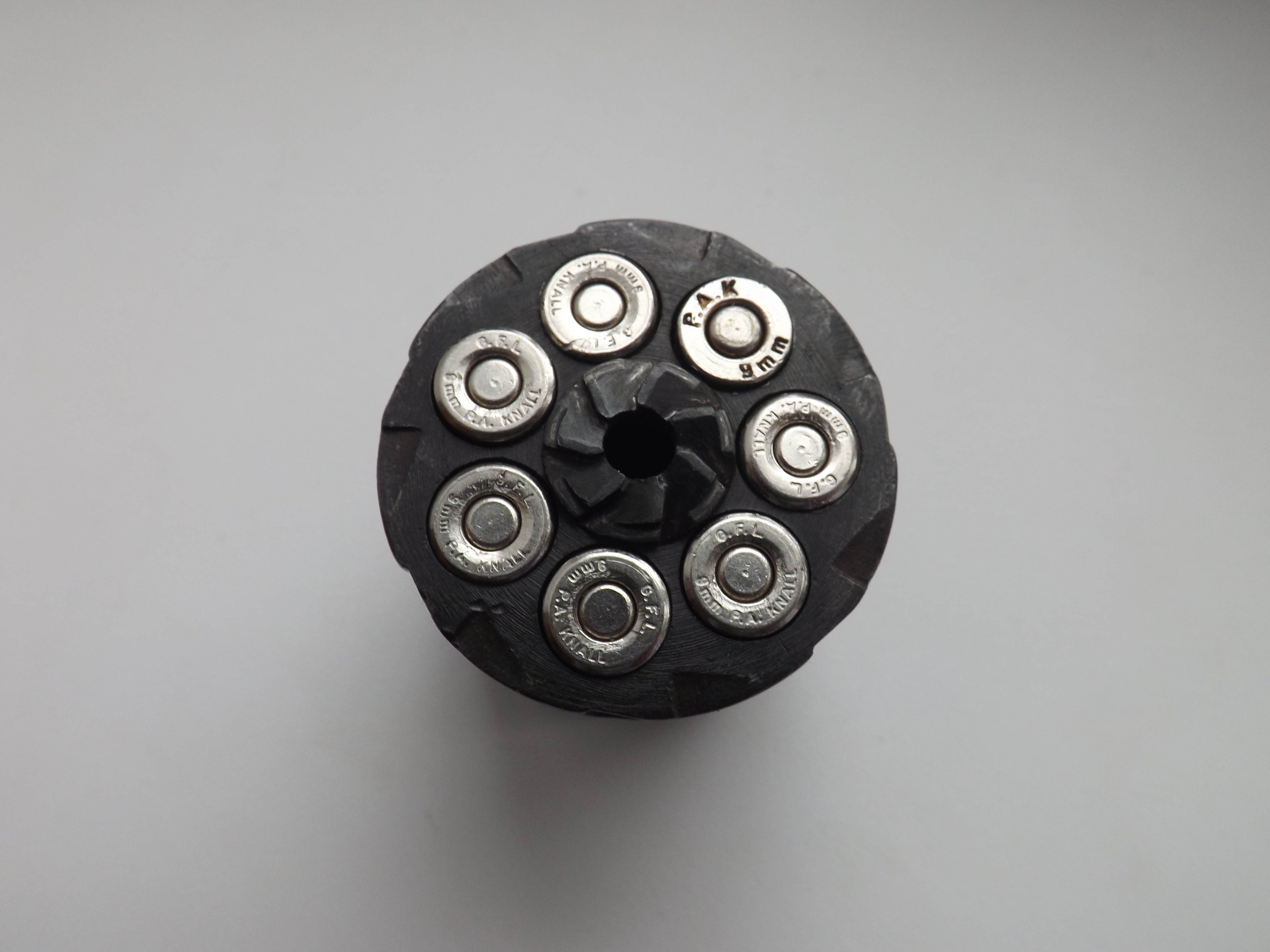 продам барабан нагана комплектный, с подвижной втулкой, под патрон 9мм РА, на барабане впрессованы втулки с донцем для обтюрации пороховых газов. гильзы в каморах сидят плотно, без люфтов, храповик в идиальном состоянии. цена 1300 грн пресыл по Украине новой почтой за счет покупателя.