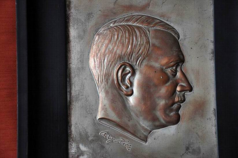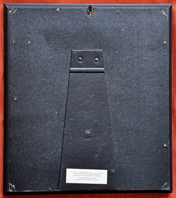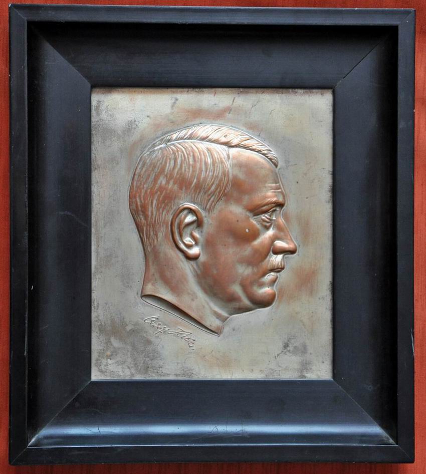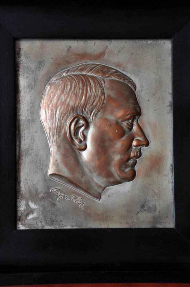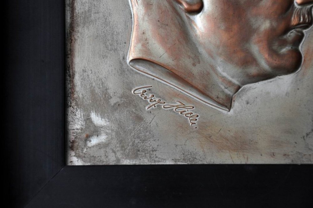 Барельеф сделан виде чеканки (цветной металл, не магнититься), покрыт был «немецким серебрением» (серебрение осталось местами).