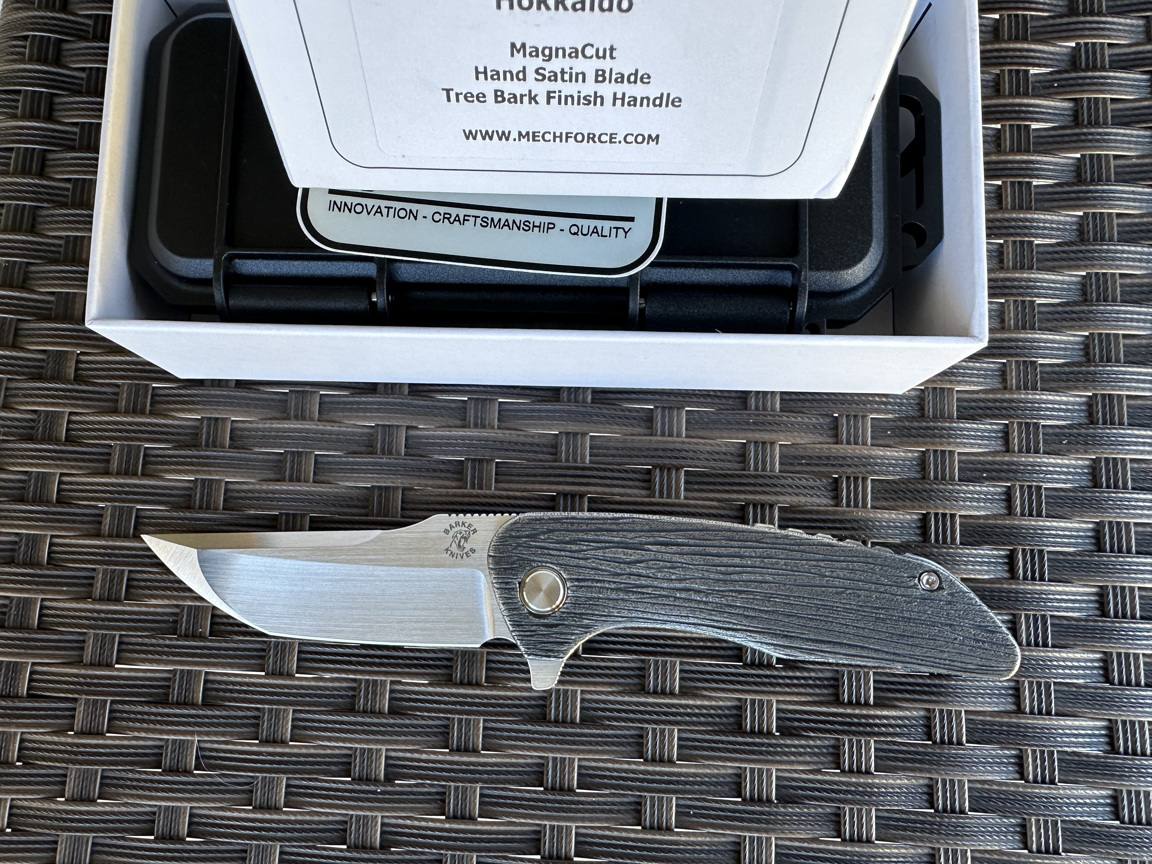 Barker Knives Hokkaido & Mechforce лимитировано по 300 ножей из трех вариаций. Это колабарация Известного мастера Barker Knives Hokkaido — это складной нож с клинком танто, разработанный для прочности и функциональности. Он имеет прочный кончик, флиппер для удобного открытия, а рукоять из титана обеспечивает надежный хват. Ключевые особенности включают обработку клинка ручным продольным сатином, рукоять с интересной и редкой обработкой (кора дерева), замок Frame Lock, подшипники для плавного хода, механика идеальная клин падает под своим весом. Комплект: коробка, пластиковый бокс. Цена: 500$ Новый! Оплата по договору. Пересылка за счет покупателя. Длина клинка: 3.50"- 8,9 см. Длина общая: 8.175" 20,8 см. Сталь клинка: CPM-MagnaCut Толщина обуха: 0.160" -4 мм Вес: 4.80 oz. -136 грамм Blade Style: Tanto Finish: Hand Satin Handle Material: Titan Handle Thickness: 0.51" Locking Mechanism: Frame Lock Pivot Assembly: Caged Ceramic Bearings Pocket Clip: Titanium Designer: John Barker (Barker Knives)