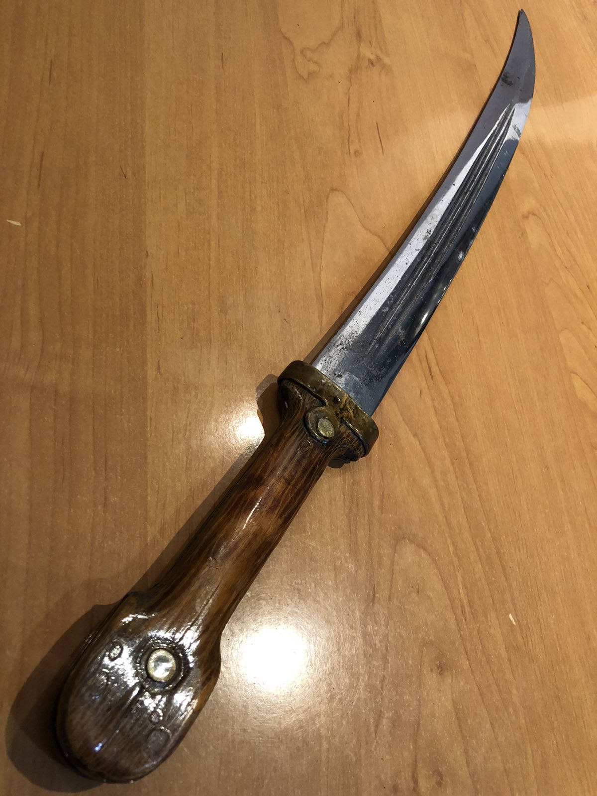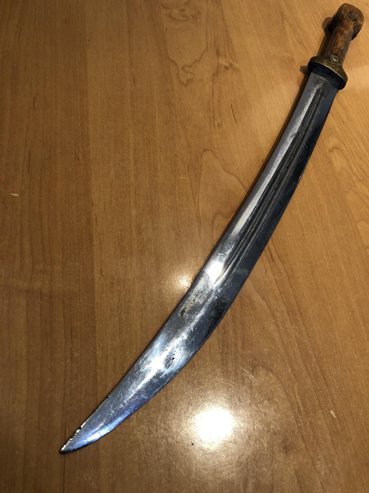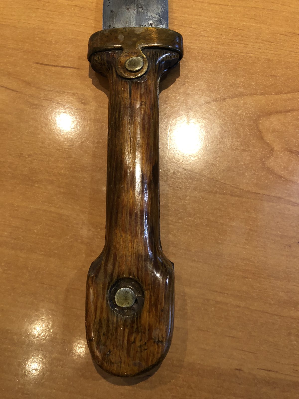 Дерево новое, прибор рукояти покалечен, по клинку кругом прошлись, что аж клейма стёрли, но все равно тысяч 7 стоит