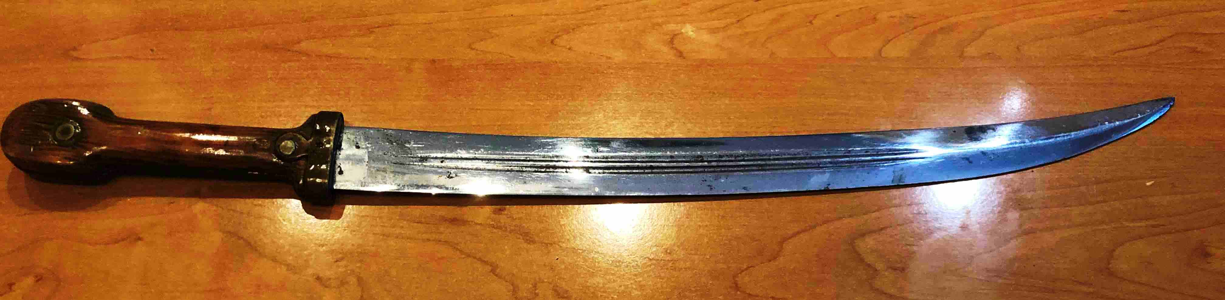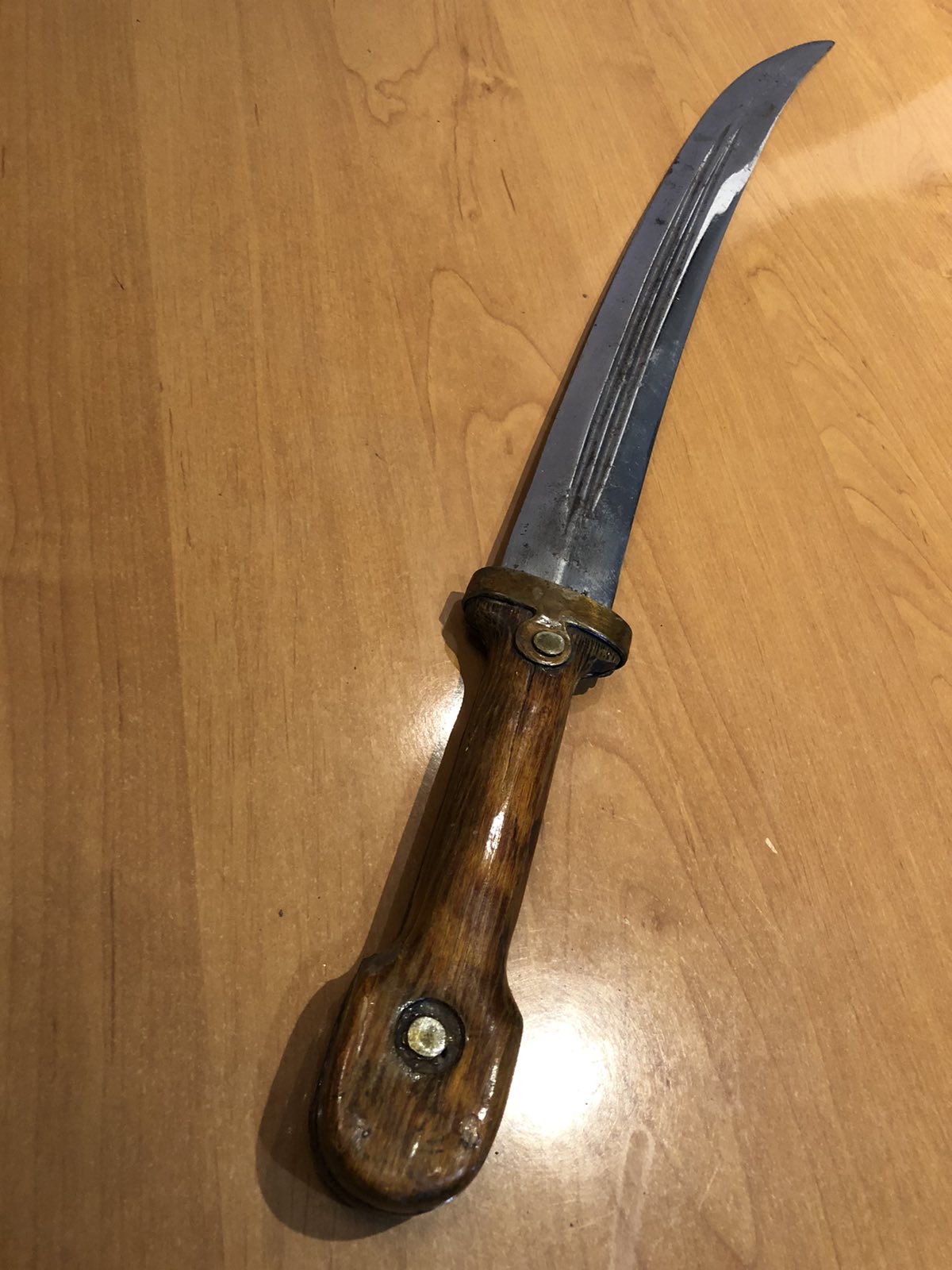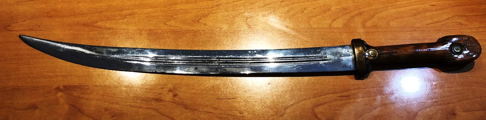 Дерево новое, прибор рукояти покалечен, по клинку кругом прошлись, что аж клейма стёрли, но все равно тысяч 7 стоит