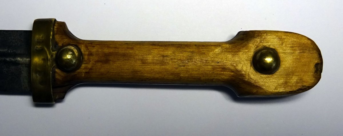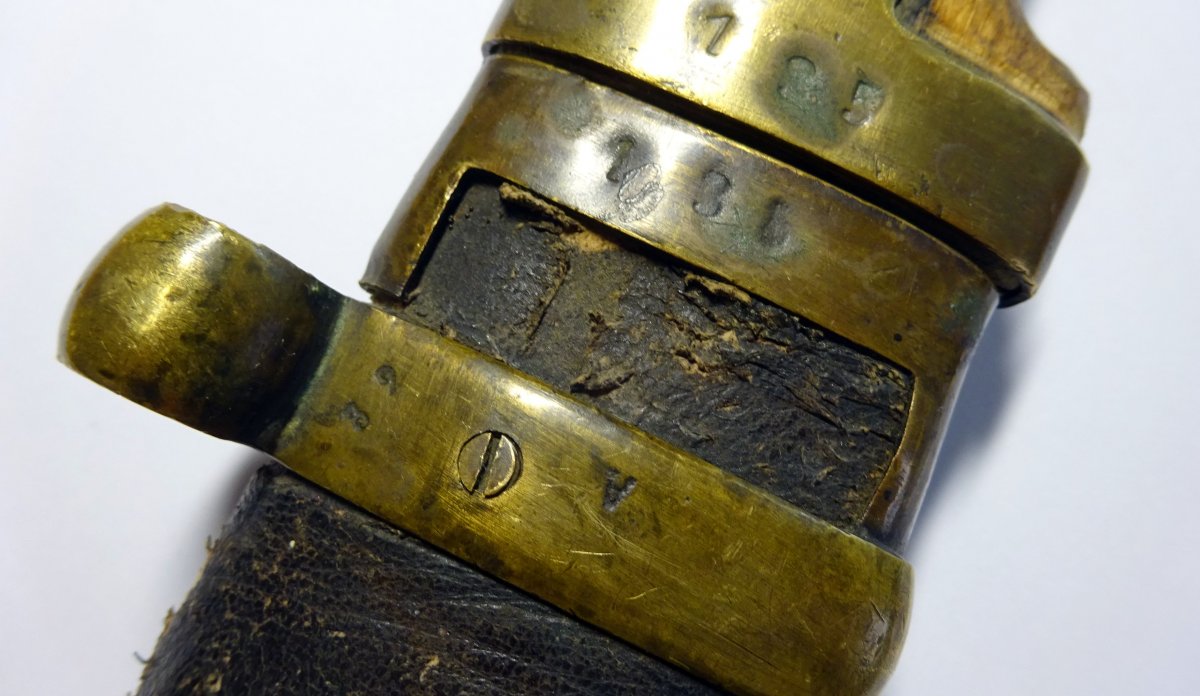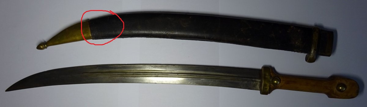 Кожа и стакан на ножнах 100% новодел не лучшего исполнения, (остаётся надеяться, что дерево оставили родное). Устье же подлинное и возможно даже родное этому предмету. Имхо.