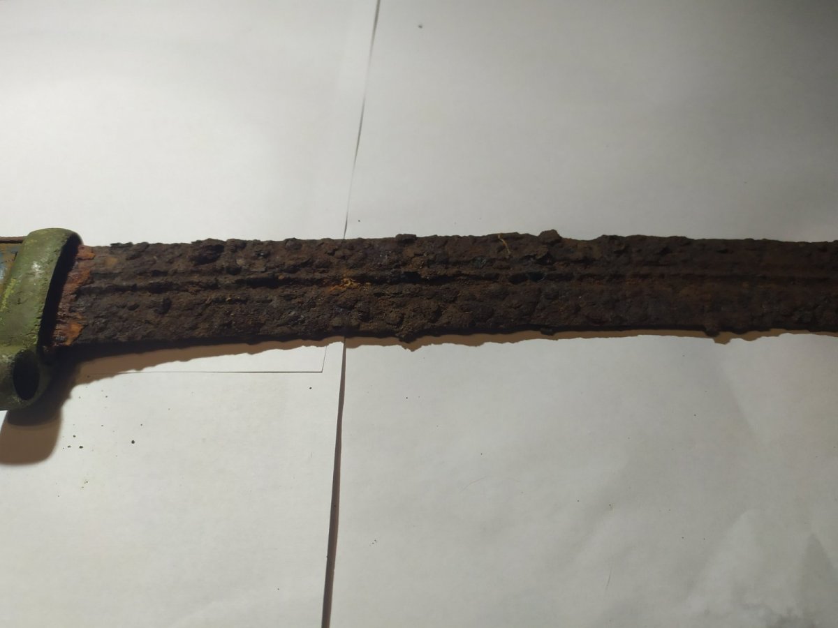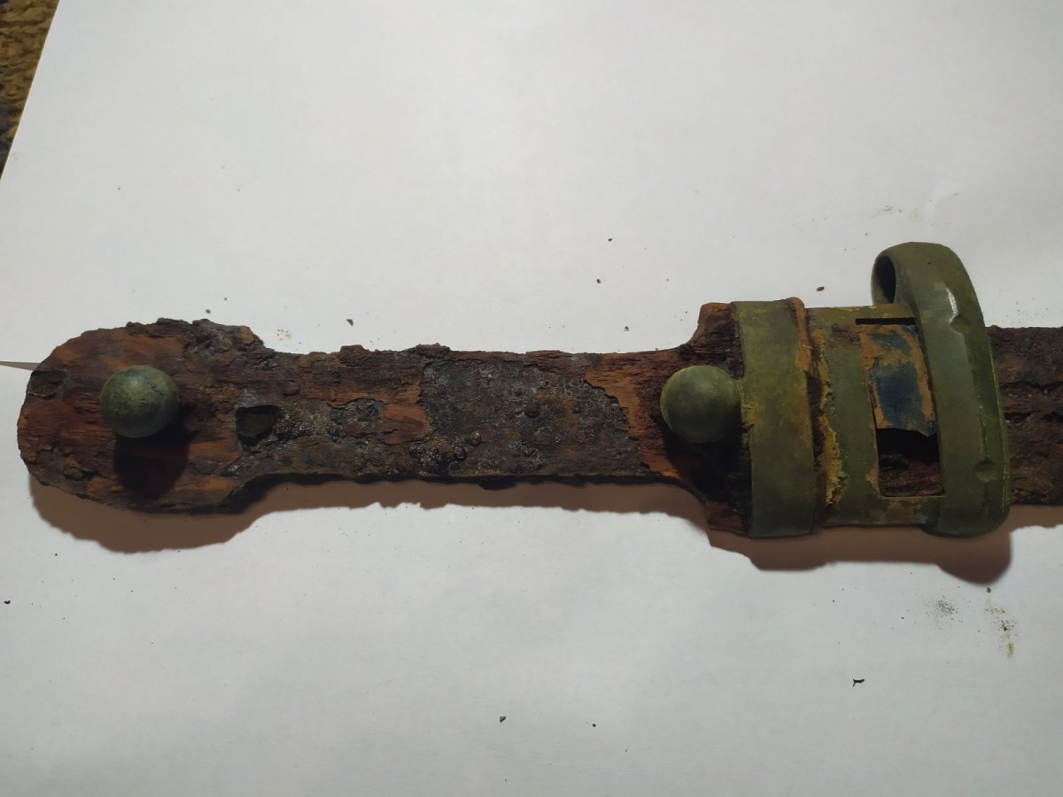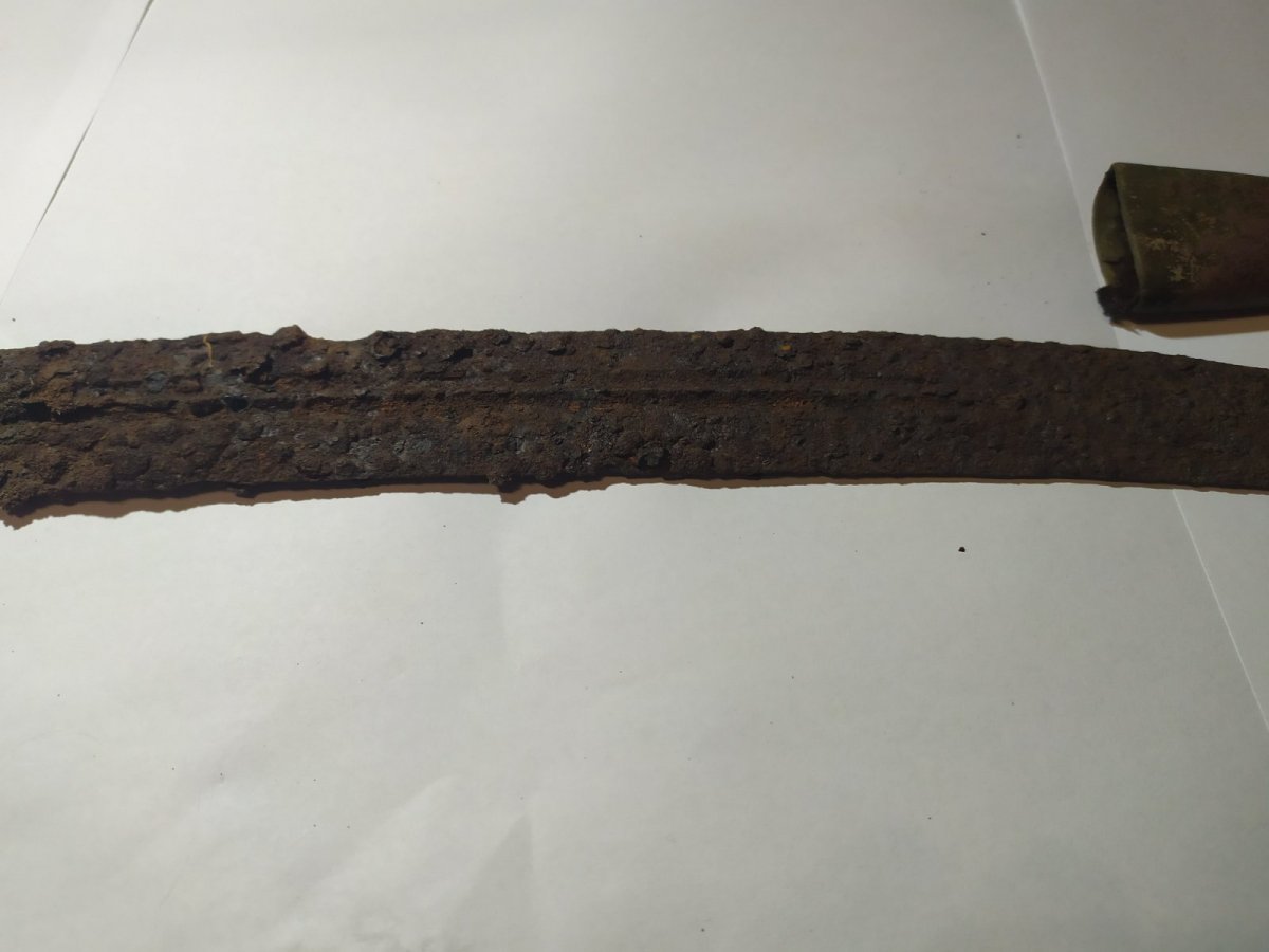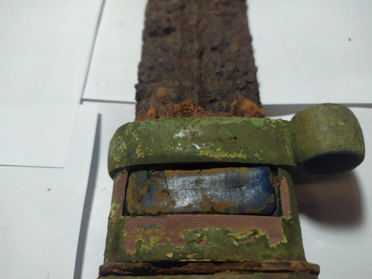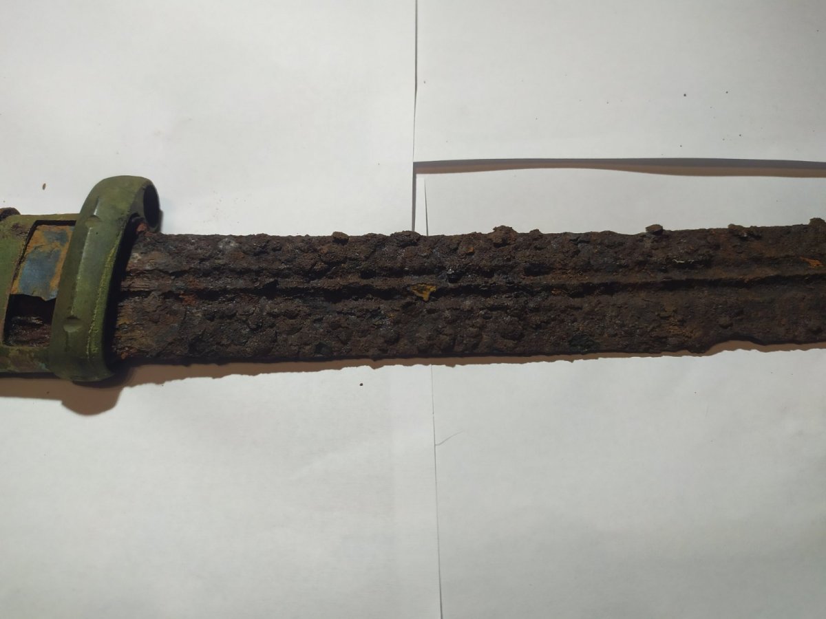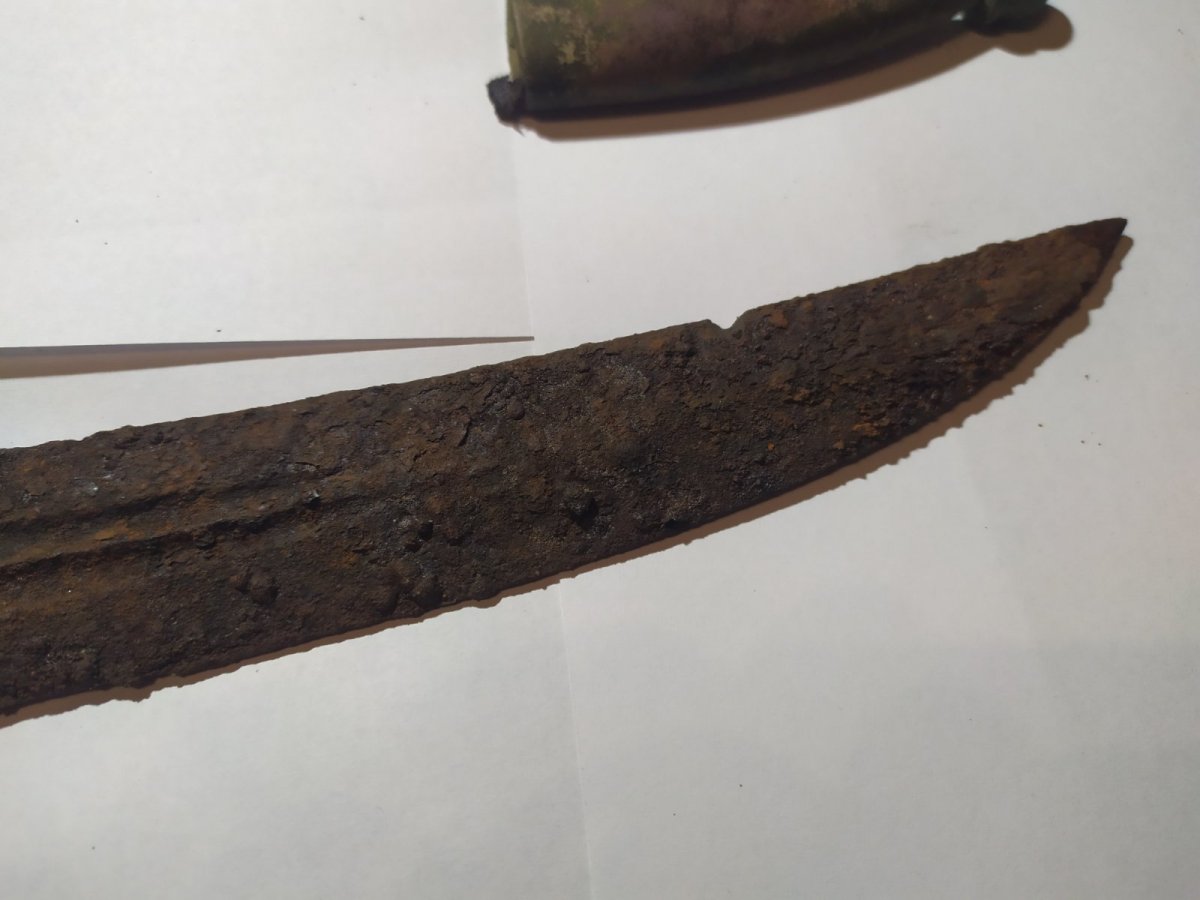 Здравствуйте. Помогите, пожалуйста, оценить данный предмет. Мыт от песка, не чищен. Из клейм нашел одно только на устье ножен. Есть два скола(указаны на фото). Заранее спасибо.