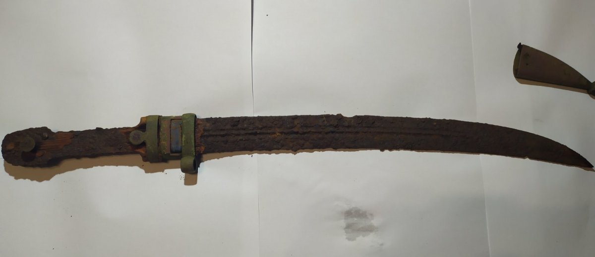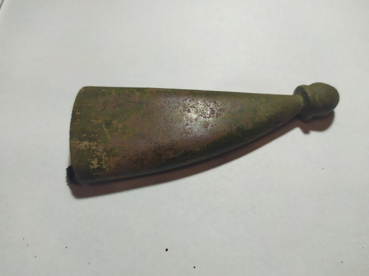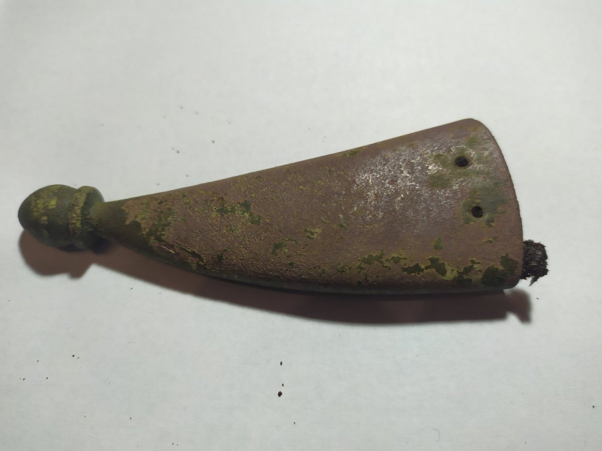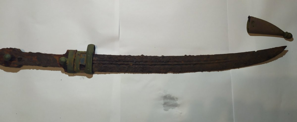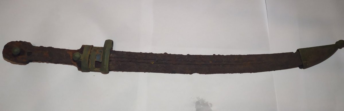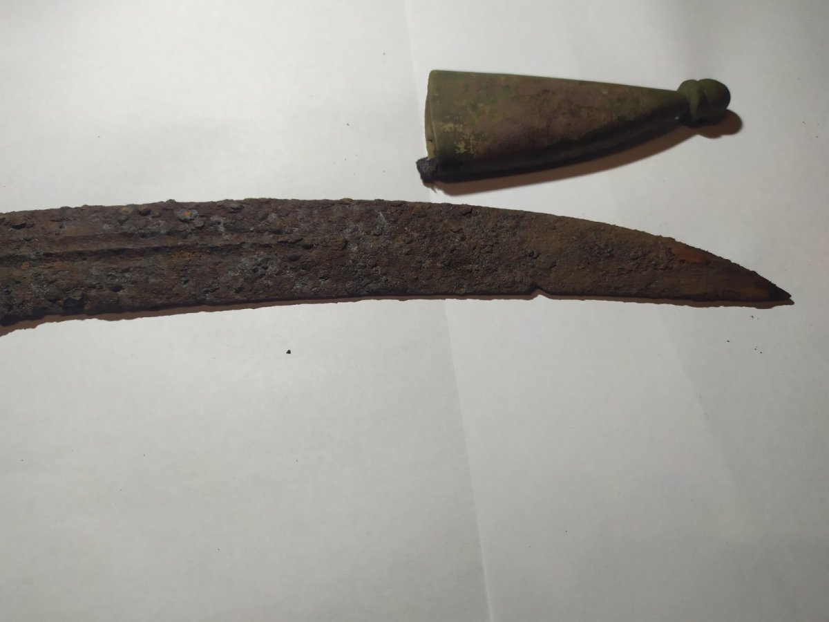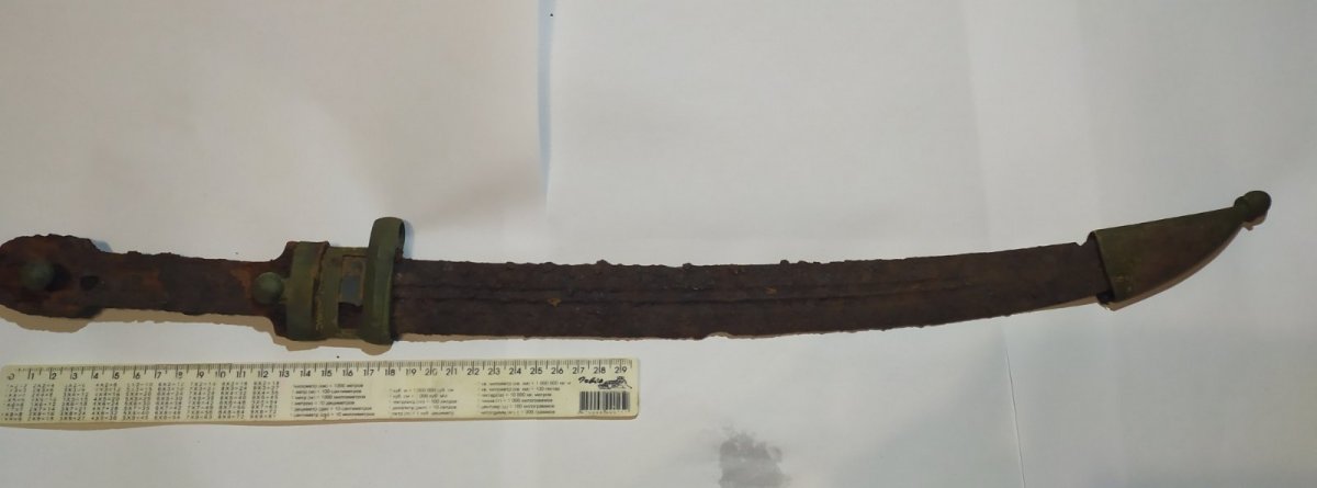 Здравствуйте. Помогите, пожалуйста, оценить данный предмет. Мыт от песка, не чищен. Из клейм нашел одно только на устье ножен. Есть два скола(указаны на фото). Заранее спасибо.