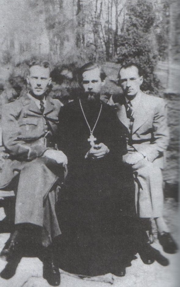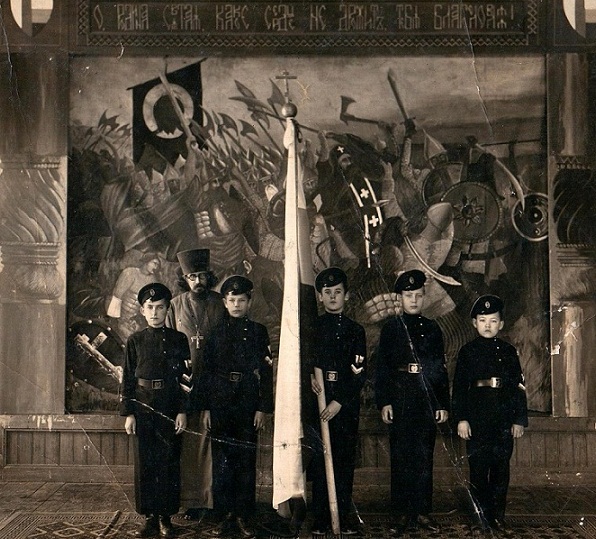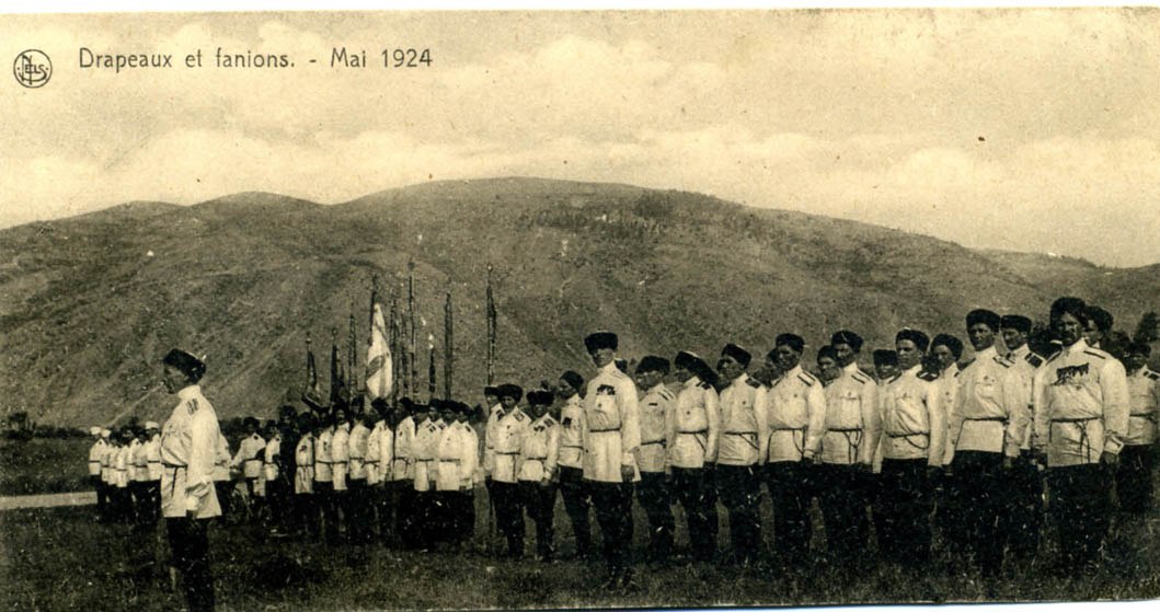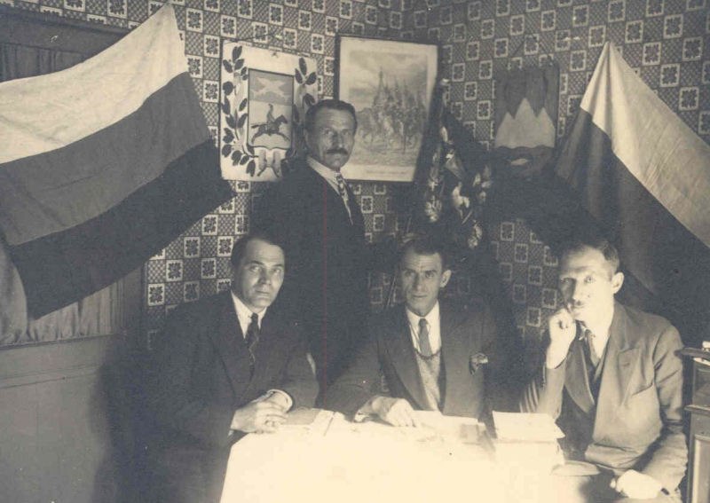 Правление Уральской Казачьей станицы в Париже 1932-33 г.г. Слева направо: сотник Кириллов К. П. (помощник атамана), есаул Филимонов Ф. К. (атаман), казак Чеботарев Г. Н. (помощник атамана), стоит вахмистр Колбанов Т. Г. (значковой)