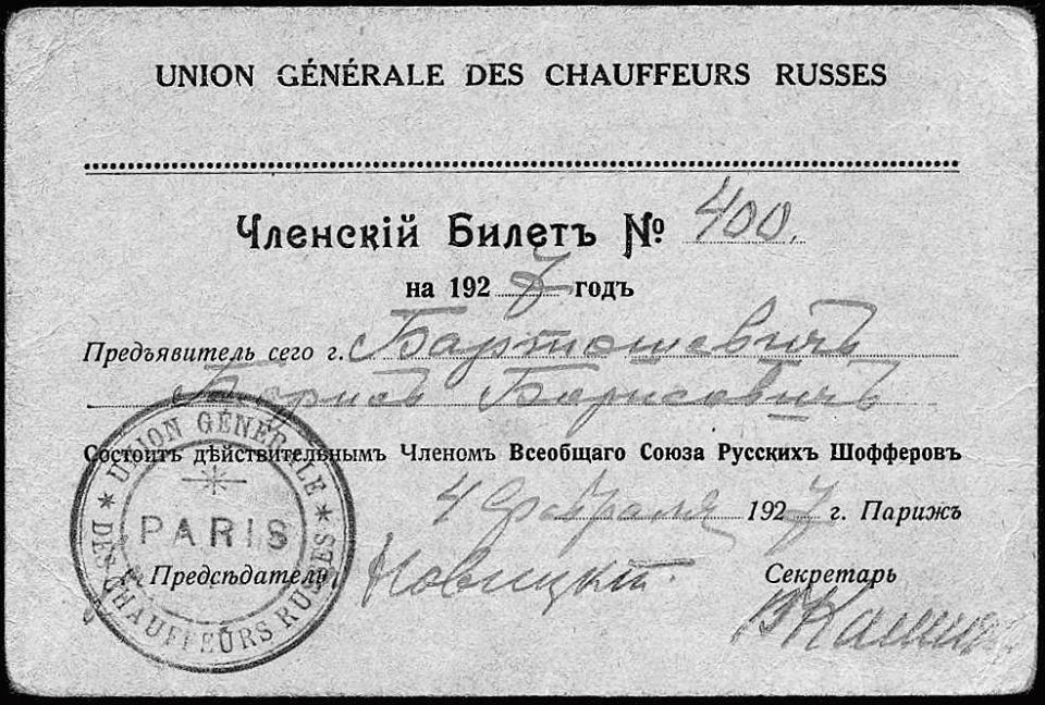 1. "Российская стоянка" шоферов такси в Париже. 18 июля 1926 г. 2. Членский билет Союза российских шоферов - бывшего офицера российской армии Бартошевича Бориса Борисовича. Париж, 1927 год.