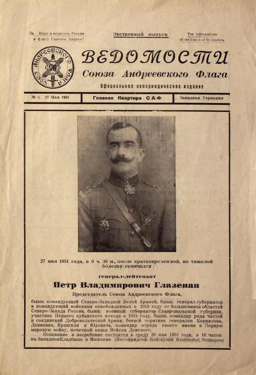 Союз Андреевского флага (САФ) (1948-1953 гг.) - антисоветская эмигрантская организация, созданная в американской зоне оккупации Германии в лагере для перемещенных лиц "Шляйсгейм" (близ г. Мюнхена) в январе 1948 года из белоэмигрантов и служивших в период второй мировой войны в военных формированиях: "Российской освободительной армии" (РОА); "Российском охранном корпусе" (РОК); казачьем корпусе Доманова и др. В программе САФ указывалось, что его задачей является продолжение антисоветской деятельности, начатой генералом Власовым. Членский знак Союза представляет собой серебряный терновый венок овальной формы, на который наложен золотой меч рукоятью вниз и сверху синий Андреевский крест с золотыми начальными буквами названия организации на нем. На обороте имелся номер. Практической деятельностью союза руководил генерал Белой армии Глазенап, а после его смерти в 1951 году - Голубинцев, который в периодГгражданской войны командовал дивизией донских казаков, активный участник РОВС и РФС. Организация САФ была построена по военному принципу. Низовым ее звеном была группа численностью 5-10 человек. Несколько групп составляли дружину, дружины сводились в отряды, отряды - в округа. Все члены союза обязательно проходили военную подготовку, изучали уставы советской армии, систему организации войсковой и агентурной разведки. С 1950 года активность антисоветской деятельности САФ начал снижаться и ко второй половине 50-х годов САФ прекратил свое существование.