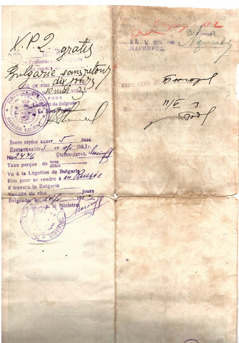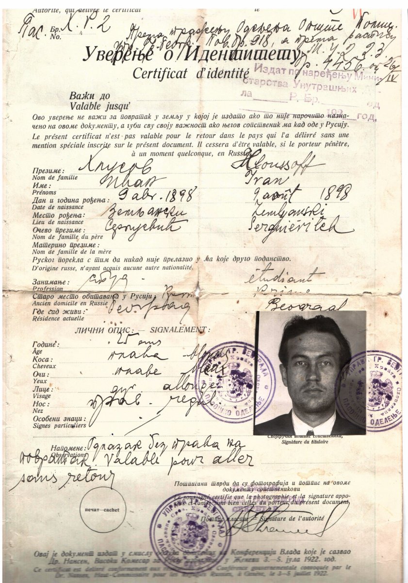 Удостоверение на право нахождения в Болгарии от 1923 года белоэмигранта Хлусова Ивана Сергеевича. Студент, скорее всего участник Великой войны, вольноопределяющийся. Впоследствии участник гражданской войны в составе ВСЮР, в эмиграции с казачьими частями в Сербии. Был выдворен из Сербии, и даже было короткое тюремное заключение, за симпатии просоветскому союзу возвращенцев. Вернулся в СССР, прошел систему лагерей, следы теряются в Красноярском крае, дата и место смерти неизвестны. Данное удостоверение пересылалось в Москву, о чем есть запись на обороте.