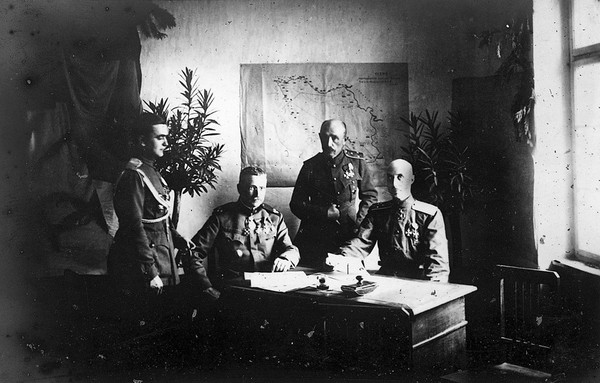 П.Н .Врангель и генералы (сидят) И.И. Чекотовский, В.В. Крейтер, В.Е. Вязьмитинов, Е.И. Мартынов, В.П. Шмит Кралево, Сербия 1924г.