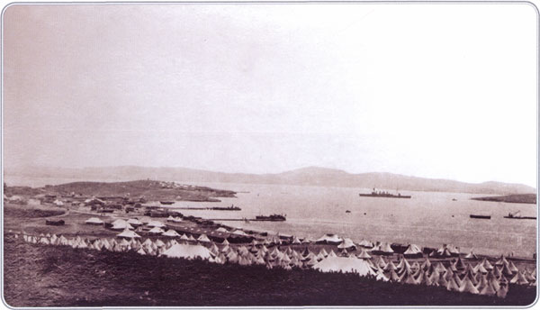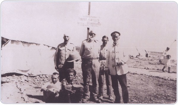 Главный комендант беженских лагерей на Лемносе генерал-лейтенант П. П. Калитин (первый справа) и генерал-лейтенант П. Н. Лазарев-Станищев (в центре). Июнь 1920 г.