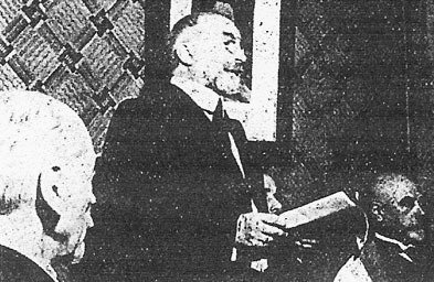 Генерал Миллер выступает на юбилее Корниловского Ударного полка. За ним видна часть лица Н.В. Скоблина и далее А.И. Деникин