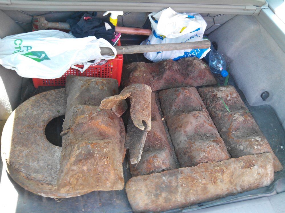 Привет,народ.Возможно немного не в тему,но необычно.Сегодня решил прошарится немного поместу по войне,небольшой овражек.По теме ничего НК вылезло кроме осколков немалого калибра и тормозного барабана,но полезло нечто другое.Железные(чугунные)отливки в форме ряда пирамидок.Причём разного размера и веса. Так как была возможность подьехать на машине-то не пропадать же добру.Погрузил и свез в приёмку,теперь пару недель буду кататься на халяву.Что актуально т.к. временно б/р.Но может кто знает что это такое.200кг.рядом 40 м.братская могила экипажа сгоревшей 34 IMG_20140514_125300.jpg -ки,но никак не привязывается ся этот девайс.Может там есть и ещё, но овражек сильно зарос и заболочен,очень трудно работать.
