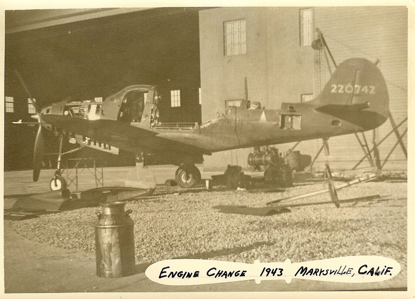 1) P-39 fighter plane (#42-20742) undergoing engine change; 1943