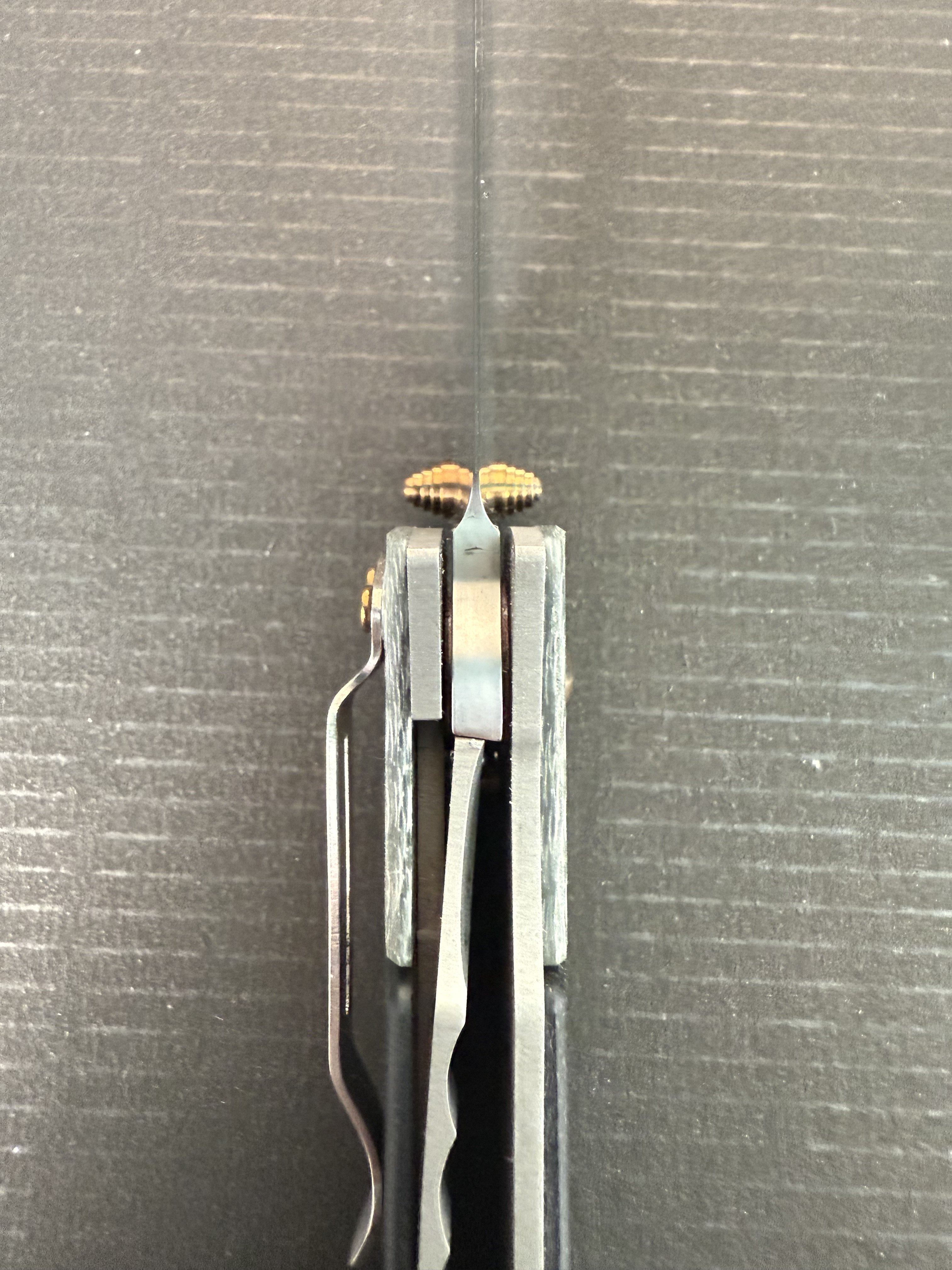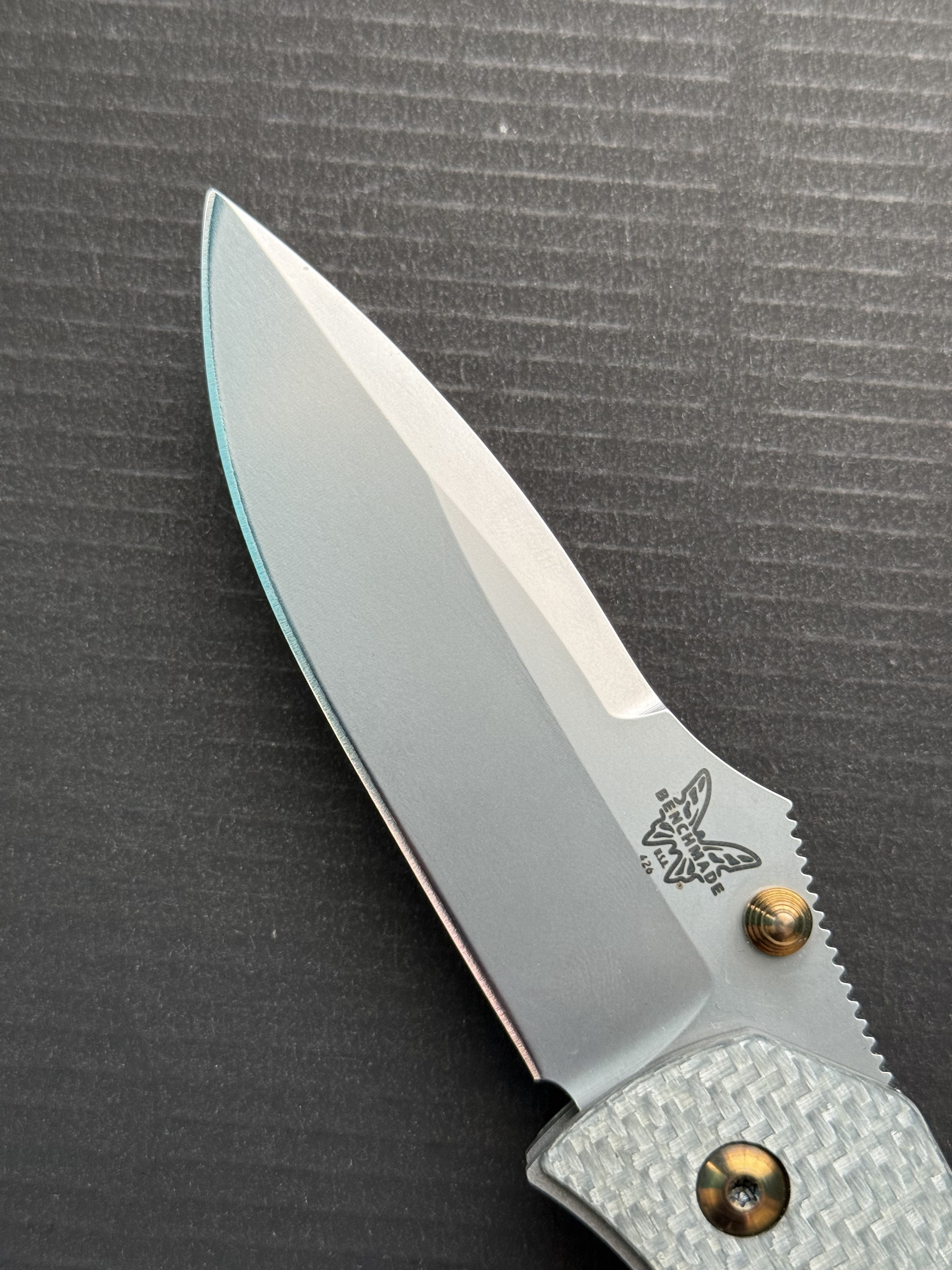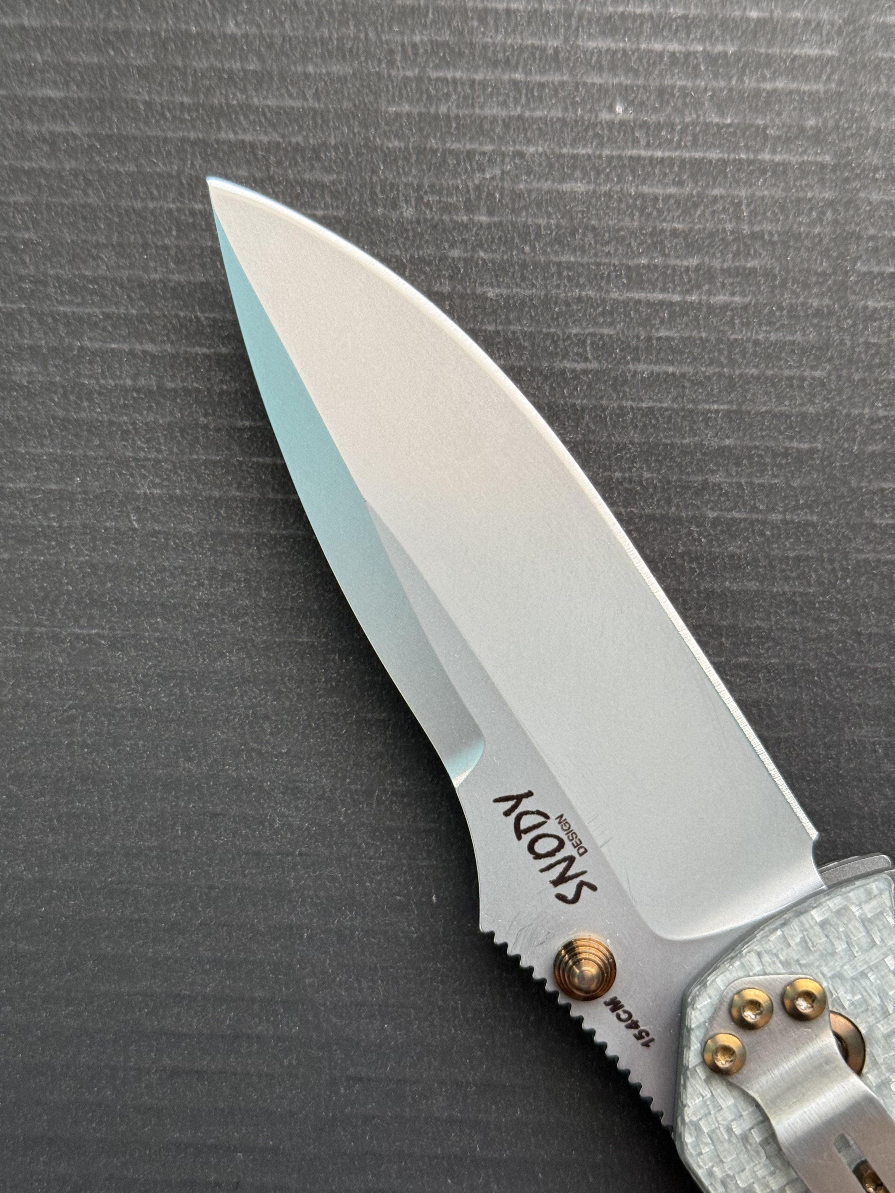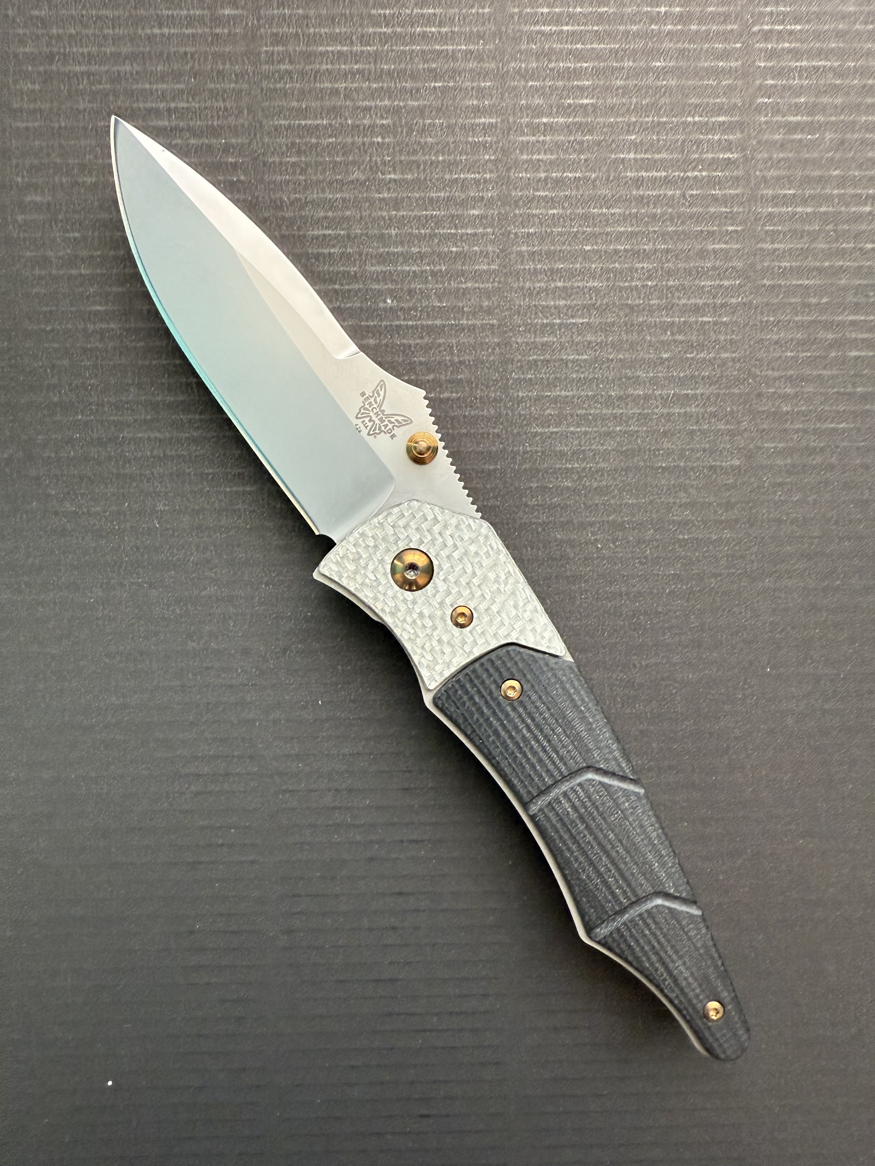 Benchmade 426 Snody Gravitator Характеристики: Довжина клинка: 88 мм Товщина клинка: 3.7 мм Довжина у відкритому стані: 210 мм Вага: 129 г Сталь на клинку: 154CM Замок: Liner Lock Матеріал руківʼя: G10/карбон Стан: ніж б/в з незначними слідами експлуатації. Встановлена нова анодована титанова фурнітура та шпень, рідна додається(в рідній пошкоджений шпень). Надзвичайно плавна механіка. Комплектація: тільки ніж Ціна:$280