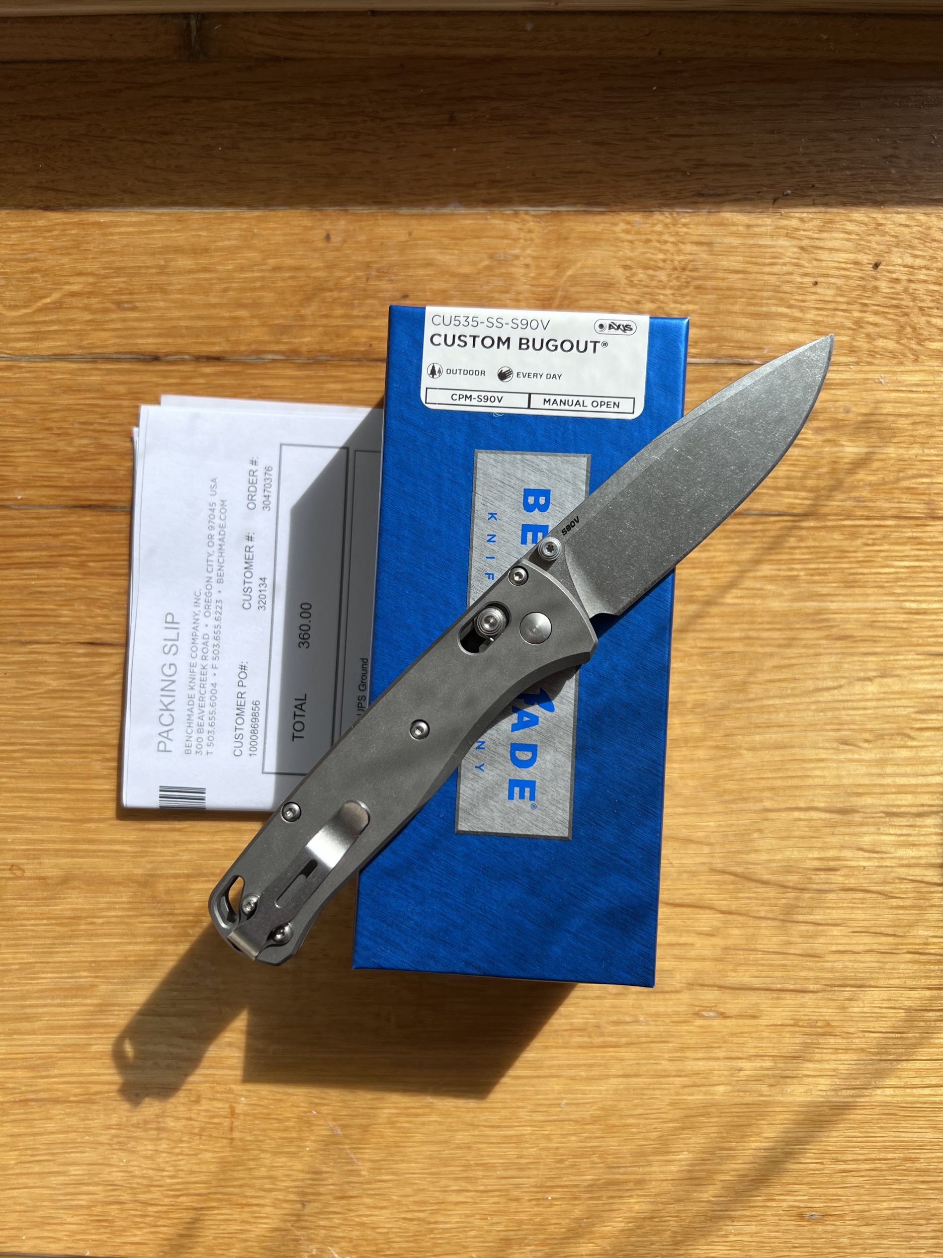 Робився на замовлення через офіційний онлайн магазин Benchmade, строк очікування виконня замовлення - 45 діб. Руків‘я - титан, клинок - S90V, усі метизи - сатин без покриття, лайнери - сатин без покриття, кліпса - сатин без покриття. Повний монохром. У використанні не був. 11200 грн.