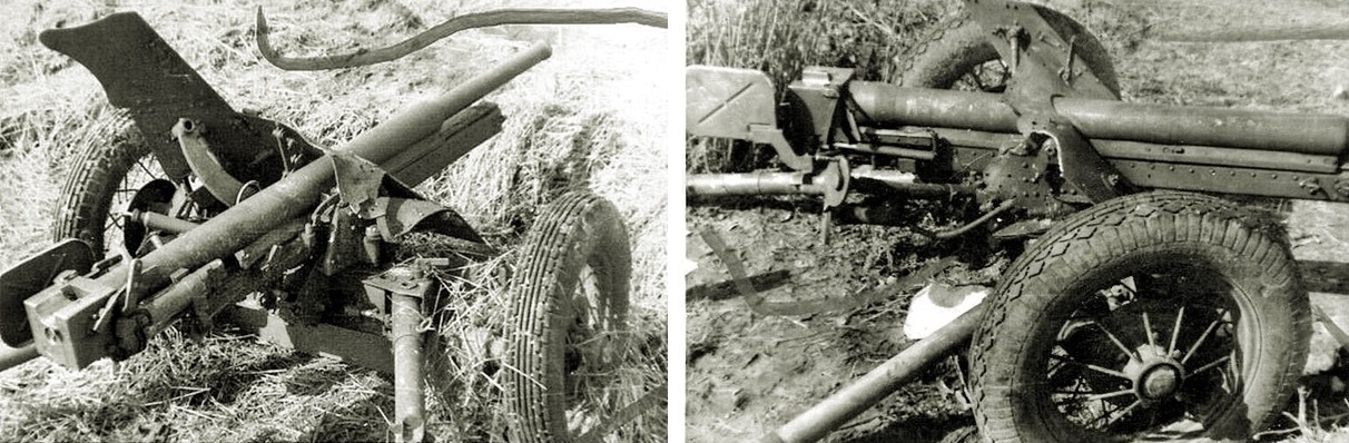 Два екземпляри 45-мм протитанкових гармат зразка 1937 року після прямих попадань в протиуламкові щити - липень 41-го, район боїв під Бердичівом. В обох випадках, якщо навідник гармати був біля прицілу... можливо тільки уявити, що стало з його головою під час вибуху німецького снаряда по щиту.