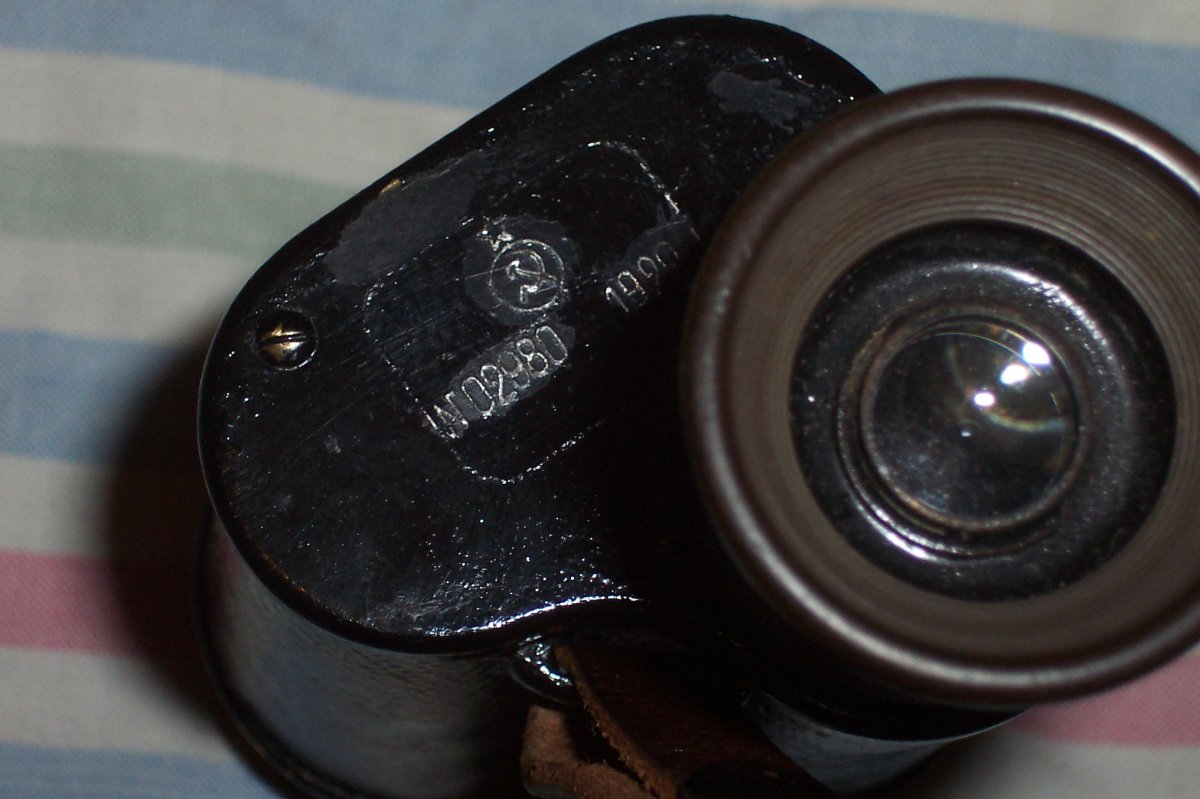 Артиллерийский бинокль РККА с "сеткой". Оптика в полном порядке, двоения нет. В правой трубе есть пара-тройка черных точек, которые никак не мешают обзору, левая труба относительно чистая. Мути и грибка не наблюдается. Юстировка в норме. Картинка качественная. Колпаки и крышки латунные. На левой стороне: маленькие серп и молот в круге, ниже - №02980 (ранний) и год (1929). С правого боку на крышке надпись: АУ (артиллерийское управление), ниже - ПРИЗМЕННЫЙ БИНОКЛЬ, еще ниже - 6х. Общее состояние очень хорошее. Цена 2100 грн.