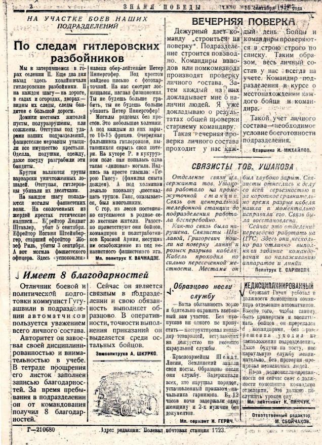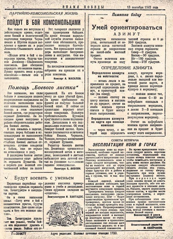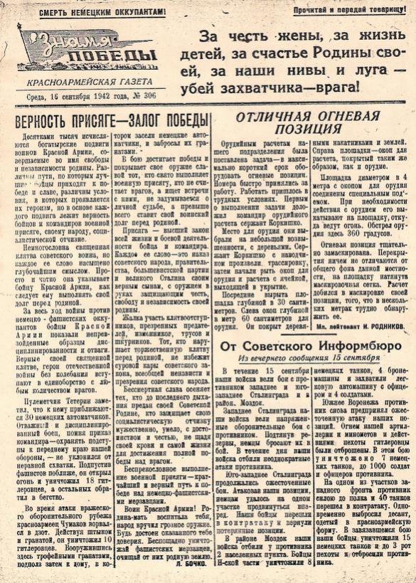 Для защитников Кавказа издавалась небольшая (примерно как формат А4) двухстраничная газета «ЗНАМЯ ПОБЕДЫ», и эти газеты от 13 и 16 сентября 1942 года.