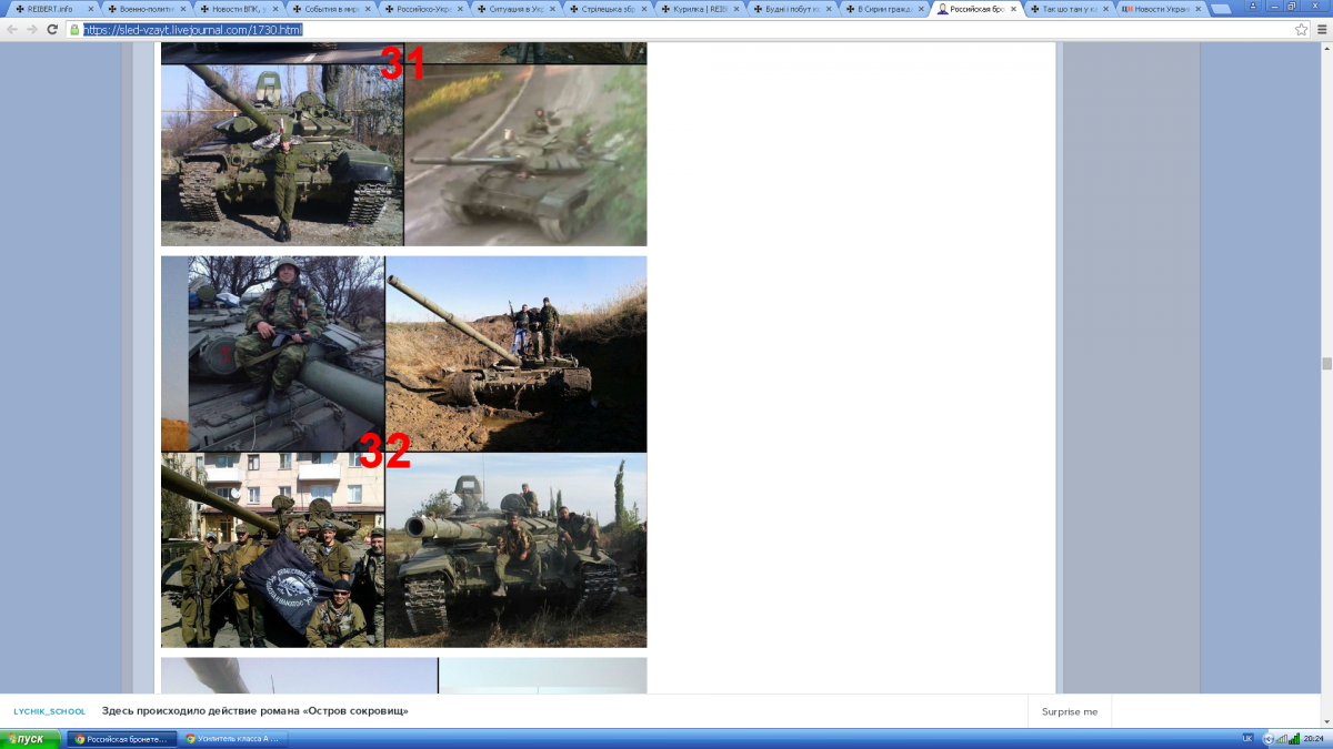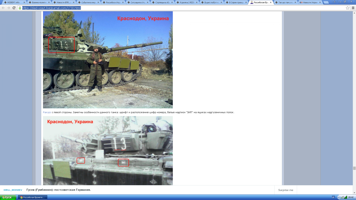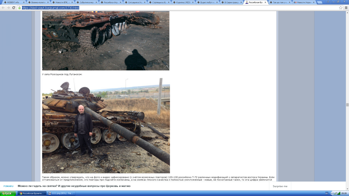 перепрошую що повторююсь ось цитата з віти С августа в Украину из России хлынул поток танков Т-72 для поддержки сепаратистов. В основном Т-72Б и Т-72Б1 образца 1984 года. Значительно реже, но всё же встречаются, Т-72Б образца 1989 года с встроенной динамической защитой "Контакт-5". Более новые модификации, военным группировкам на Донбасс, вероятно, не поставлялись, а использовались войсками вторжения Вооруженных сил РФ (к примеру, на Т-72БА воевала 21 отдельная мотострелковая бригада, на Т-72Б3 - 6-я отдельная танковая бригада, 200-я и 17-я отдельные мотострелковые бригады). По имеющимся фотографиям и видео из средств массовой информации, социальных сетей можно произвести ориентировочный подсчёт количества танков Т-72, которые Россия завезла в восточную Украину на данный момент. Естественно, следует понимать, что не все танки есть на снимках, а новые фото появляются каждую неделю. То есть фактически получится ориентировочное минимальное число танков. Из подсчёта исключаются Т-72Б образцов 1984, 1989 годов 74-й отдельной мотострелковой бригады из Кемеровской области, чьи танки с отличительными красными буквами "Л" были засняты на видео между Молодогвардейском и Краснодоном. По возможности предпринимаются меры, направленные на исключение повторного подсчёта одних и тех же боевых машин (для энтузиастов данной тематики в следующей записи будет дана ссылка на архив всех фотографий Т-72 сепаратистов на Донбассе - более 600 файлов, - по которым ввёлся данный подсчёт). подивіться будласка на малюнки №№ 31,32 https://sled-vzayt.livejournal.com/1730.html