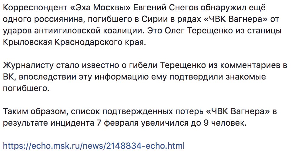 девять??? Помните проскакивал позывной "Коммунист", погибший от бомб подлых америкозов ? Боец ЧВК Вагнера с позывным «Коммунист», о возможной гибели которого на этой неделе Znak.com сообщил атаман станицы Свято-Никольская в Асбесте Олег Сурнин, возможно, является бывшим заместителем командира народной милиции ЛНР Виталием Киселевым, которого в 2016 году задержали по обвинению в организации госпереворота. Об этом корреспонденту нашей интернет-газеты рассказал свердловчанин, воевавший ранее в ополчении Луганска и имевший отношение к структурам госбезопасности самопровозглашенной республики. https://www.znak.com/2018-02-15/sre..._vozmozhno_okazalsya_eks_komandir_milicii_lnr Погоняло таки сходится http://informator.media/archives/180180 Луганчанин https://myrotvorets.center/criminal/kiselev-vitalij-viktorovich/