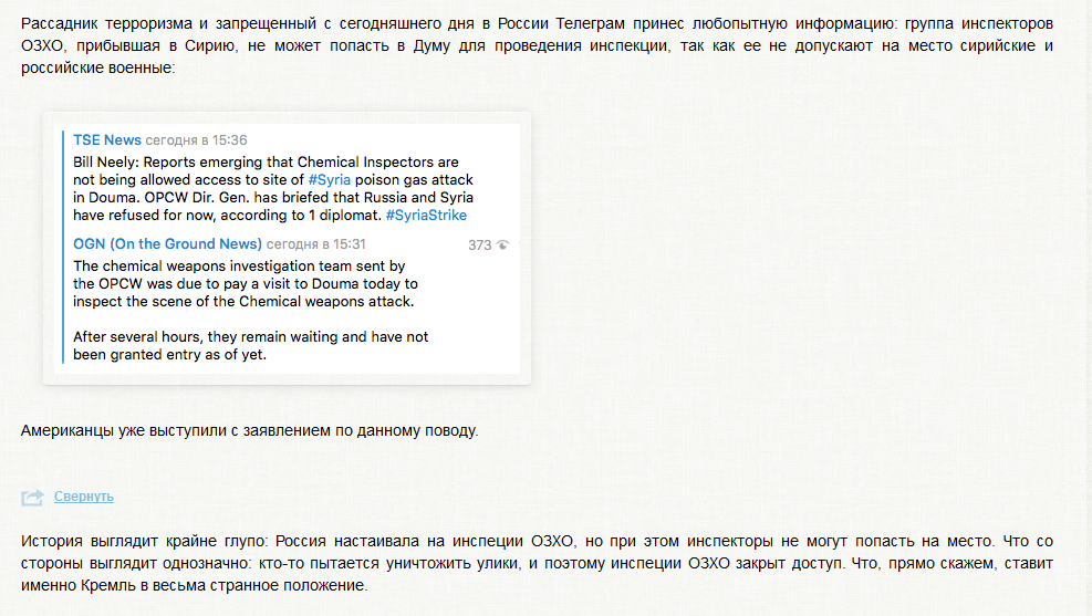 Инспекция ОЗХО "Рассадник терроризма" и запрещенный с сегодняшнего дня в России Телеграм принес любопытную информацию: группа инспекторов ОЗХО, прибывшая в Сирию, не может попасть в Думу для проведения инспекции, так как ее не допускают на место сирийские и российские военные: Американцы уже выступили с заявлением по данному поводу. История выглядит крайне глупо: Рашка настаивала на инспеции ОЗХО, но при этом инспекторы не могут попасть на место. Что со стороны выглядит однозначно: Рашка совместно с Асадом пытается уничтожить улики, и поэтому инспеции ОЗХО закрыт доступ. Парадокс может объясняться тривиально: в последний момент могла вскрыться какая-то информация, которая и вынуждает действительно спешно зачищать территорию, плюнув на подозрения. Если инспекторов ОЗХО будут "мурыжить" и дальше, это грозит крайне неприятными последствиями - безо всякой инспекции постфактум Рашку могут обоснованно обвинить в сокрытии улик, после чего смысл инспекции потеряется напрочь. Рашка просто распишется в своей причастности к происшествию, которое и без того особых сомнений не вызывает, а теперь получит вообще железное подкрепление любых подозрений.