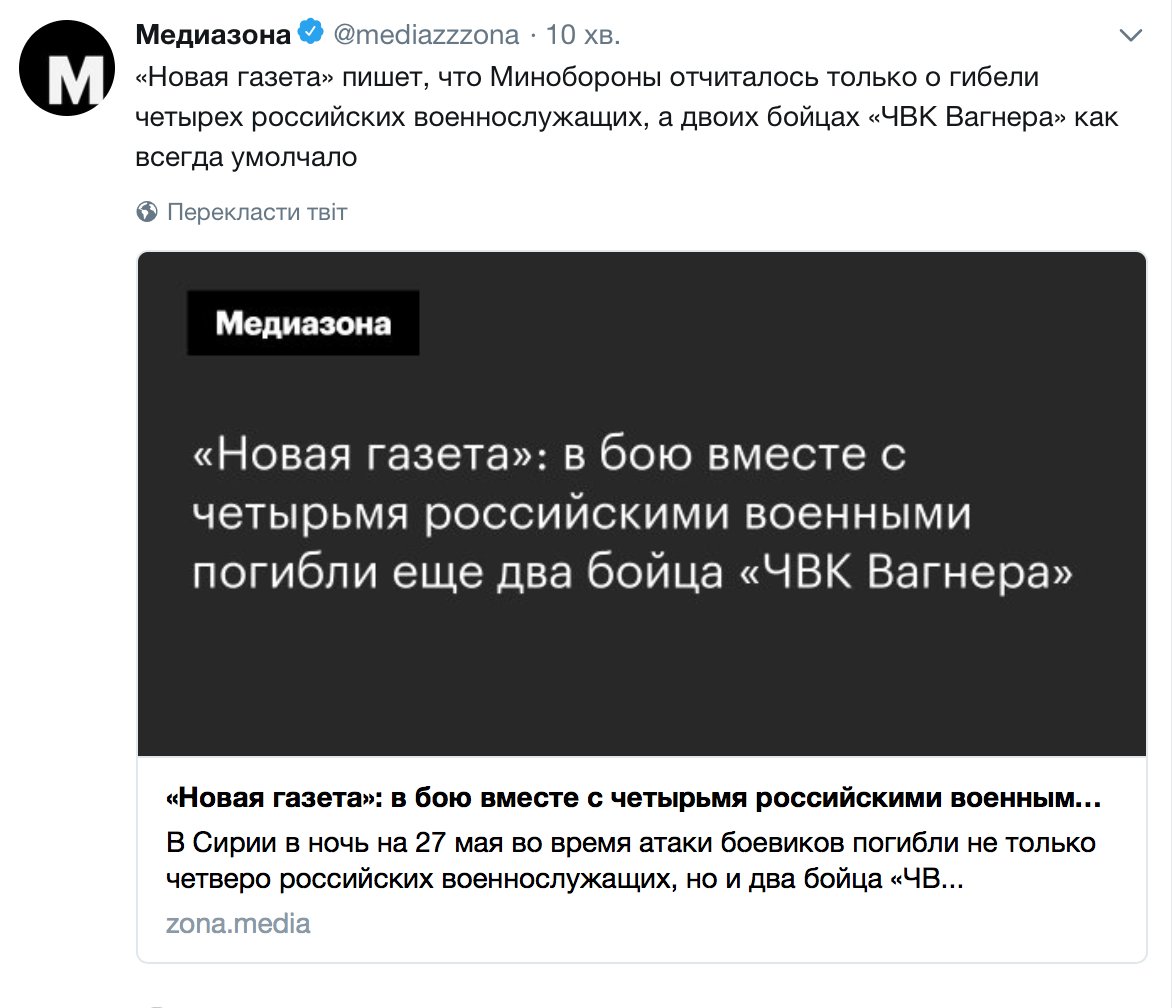 У Сирії за тиждень загинули десятки проурядових бійців - спостерігачі Спостерігачі повідомляють, що серед 35 загиблих бійців сирійських проурядових сил щонайменше дев'ятеро росіян. У Москві ж підтвердили загибель лише чотирьох своїх військових. Внаслідок атак бойовиків "Ісламської держави" (ІД) на сході Сирії упродовж останнього тижня загинули десятки бійців проурядових сил, повідомили у неділю, 27 травня, в базованому в Лондоні Сирійському центрі моніторингу за дотриманням прав людини. Найбільш кривавим виявився напад, вчинений 23 травня поблизу містечка Меядін у провінції Дейр-ез-Зор. "Було вбито 35 проурядових військових, включно з щонайменше дев'ятьма росіянами. Дехто з росіян належав до урядових військ, але не всі із них", - заявив керівник центру Рамі Абдель Рахман, цитує агентство AFP. Інші 26 загиблих військових, за даними центру, - сирійці. http://www.dw.com/uk/у-сирії-за-тиж...43951160?maca=ukr-rss-ukrnet-ukr-all-3816-xml