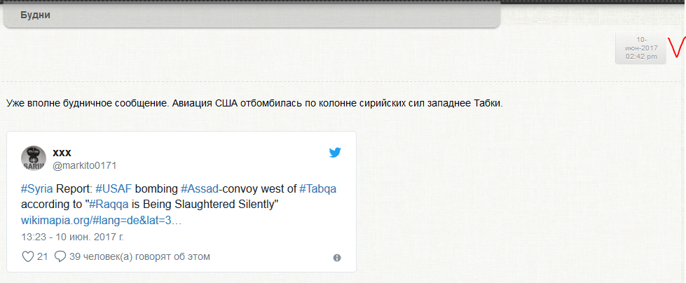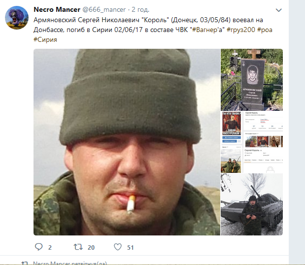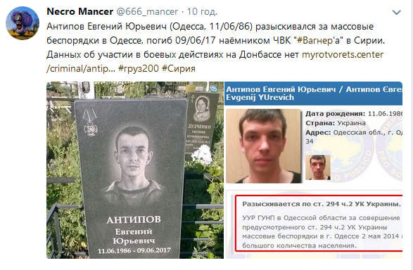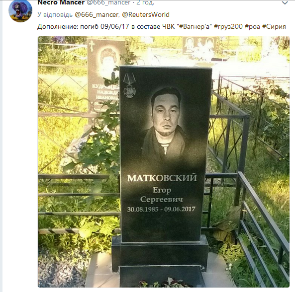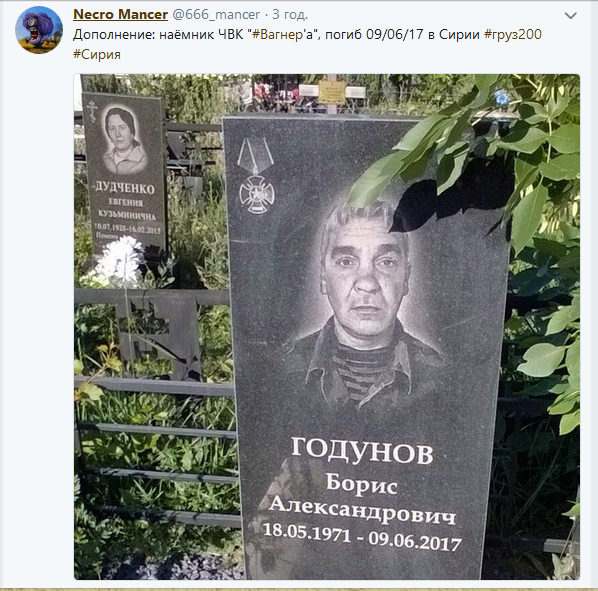 Іще один: Четверо з датою загибелі 09.06.2017. Погуглив. Якраз тоді авіація коаліції завдавала ударів по військах Асада. Схоже, вагнерівці потрапили під роздачу. Ось, допис 09.06.17: А це 10.06.17:
