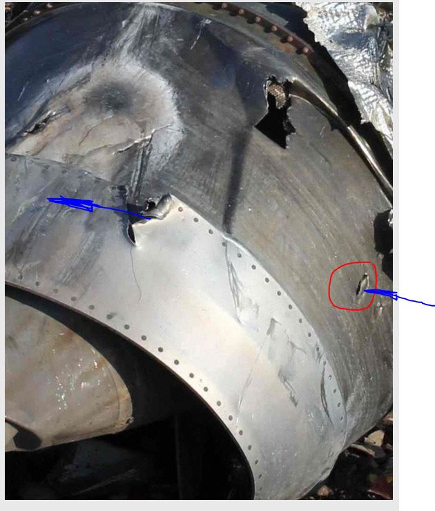 Все эти теории с двигом притянуты за уши. Двиг не может дать такое пламя, даже горящий. Если конечно в него не залетела ракета или её элемент и он не разрушился и при разрушении не пробил баки с топливом. Но это уже следствие, а не первопричина. Вот это фото. Одному мне кажется, что внизу входящее отверстие, его как бы упустили. А сфокусировались на выходящем. Хотя все эти теории не более чем информ пыль для отвлечения внимания от основной версии.