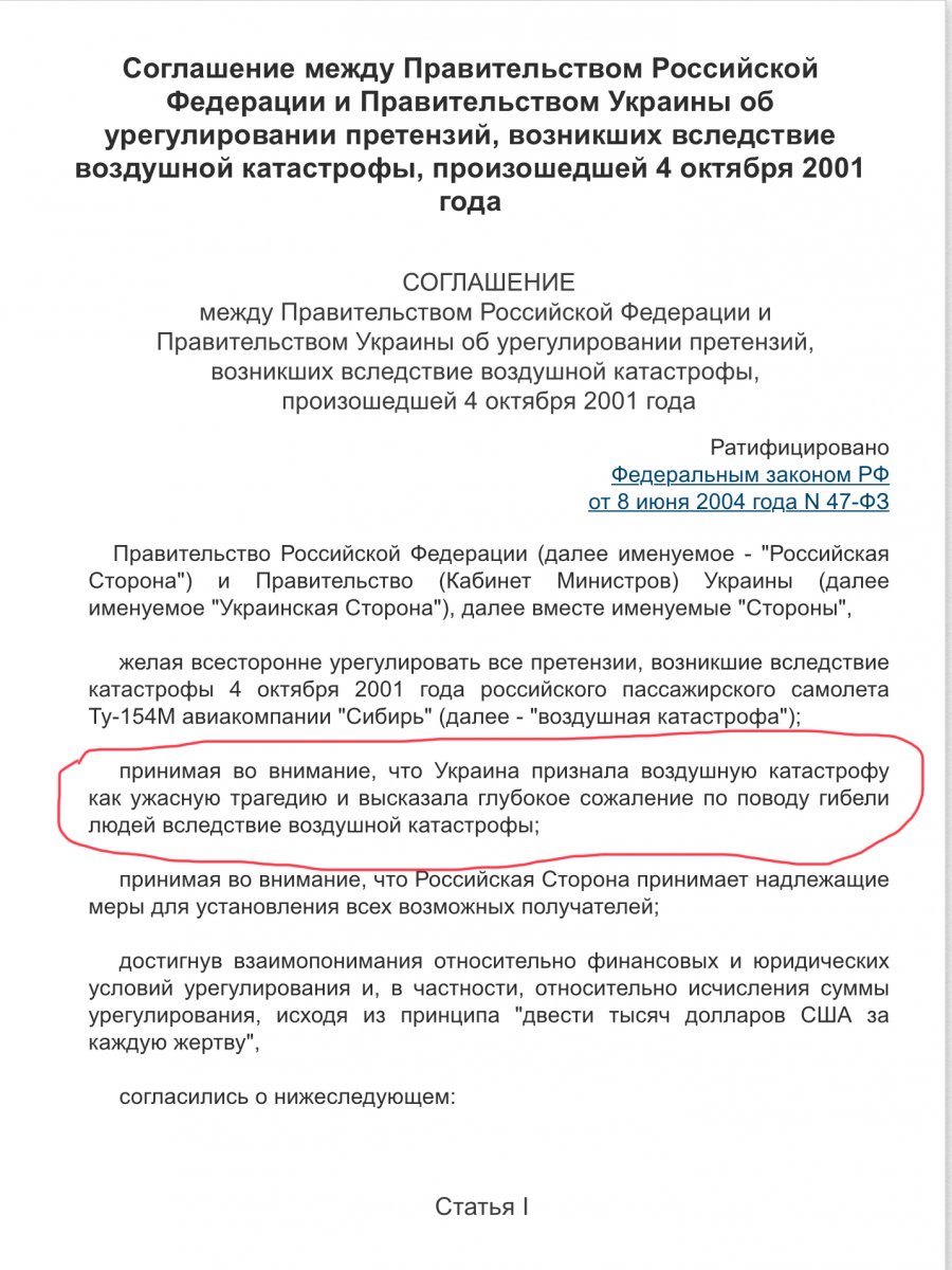 Кузьмук тогда отпирался до последнего. Пока американцы не вызвали нашего посла в США и не показали спутниковые снимки. Ну а соглашение - нужно же было как то решить эту ситуацию, выплатить компенсации семьям погибших.