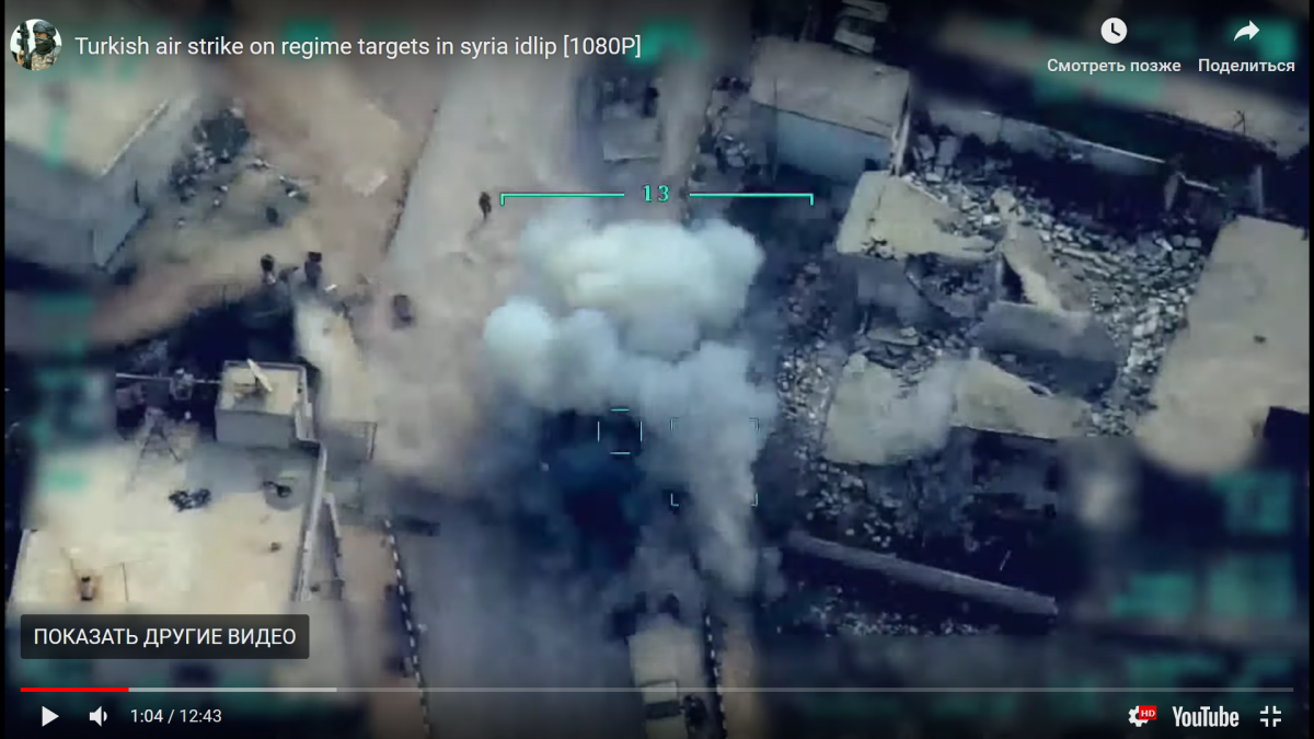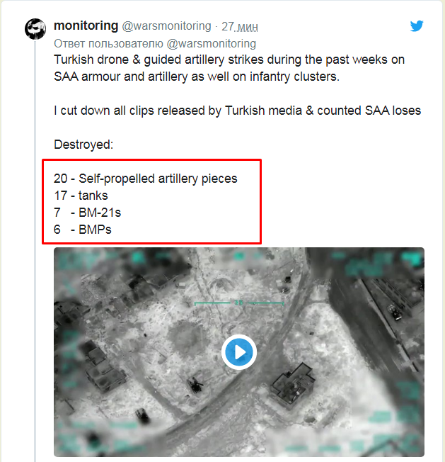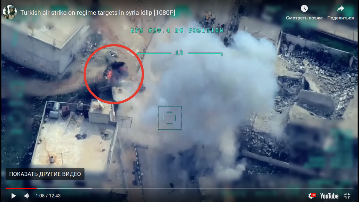 Ще раз передивився відео, що цікаве впало в очі: підриви ракет в БМ-21, робота по знищенню батареї 2с3 яку не могла знищити турецька артилерія, польти бешен танків Т-72 і як мех вод тікав з підбитого танка (довелось своїм підбитим танком над собою проїхати). А взагали то турки роздовбали підсилену танкову батальйонну тактичну групу. Зверніть увагу як змінилась картинка наступу асадокацапів: раніш 2-5 танків арта приципні гармати, зараз все по підручникам каців : танкове угруповання за підтримки сау і РСЗВ. Складається враження що наступають вонитаместь. -17 підбитих (на відео ) + затрофеїні - дівізіон 2с1 та дівізіон 2с3 - пів дівізіона градів це що потратило до підрахунків