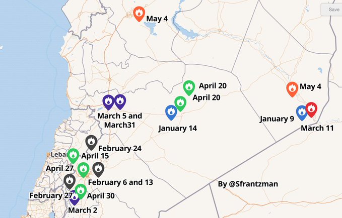 Надходять повідомлення про нібито скорочення військової присутності Ірану в Сирії. Навіть виведення сил з деяких баз. Хоча скоріш за все це рано чи пізно станеться, бо Ізраїль оголосив нову стратегію протидії Ірану і вже ніхто не зможе переховувати іранських бойовиків безкарно. На малюнку місця ударів “невстановлених” літаків ізраїльських ВПС з початку року.Але ще надійшла новина, про те що Іран почав використовувати російську базу «Хмеймім» з дозволу рашки проти Ізраїлю. Кажуть, що 4 травня Іран здійснив перекидання військової техніки на територію авіабази вс рф «Хмеймім». Дана інформація підтверджується системою відстеження польотів Flyradar. І якщо бути послідовним, то лише одне питання до ізраїльських льотчиків: «Коли?».