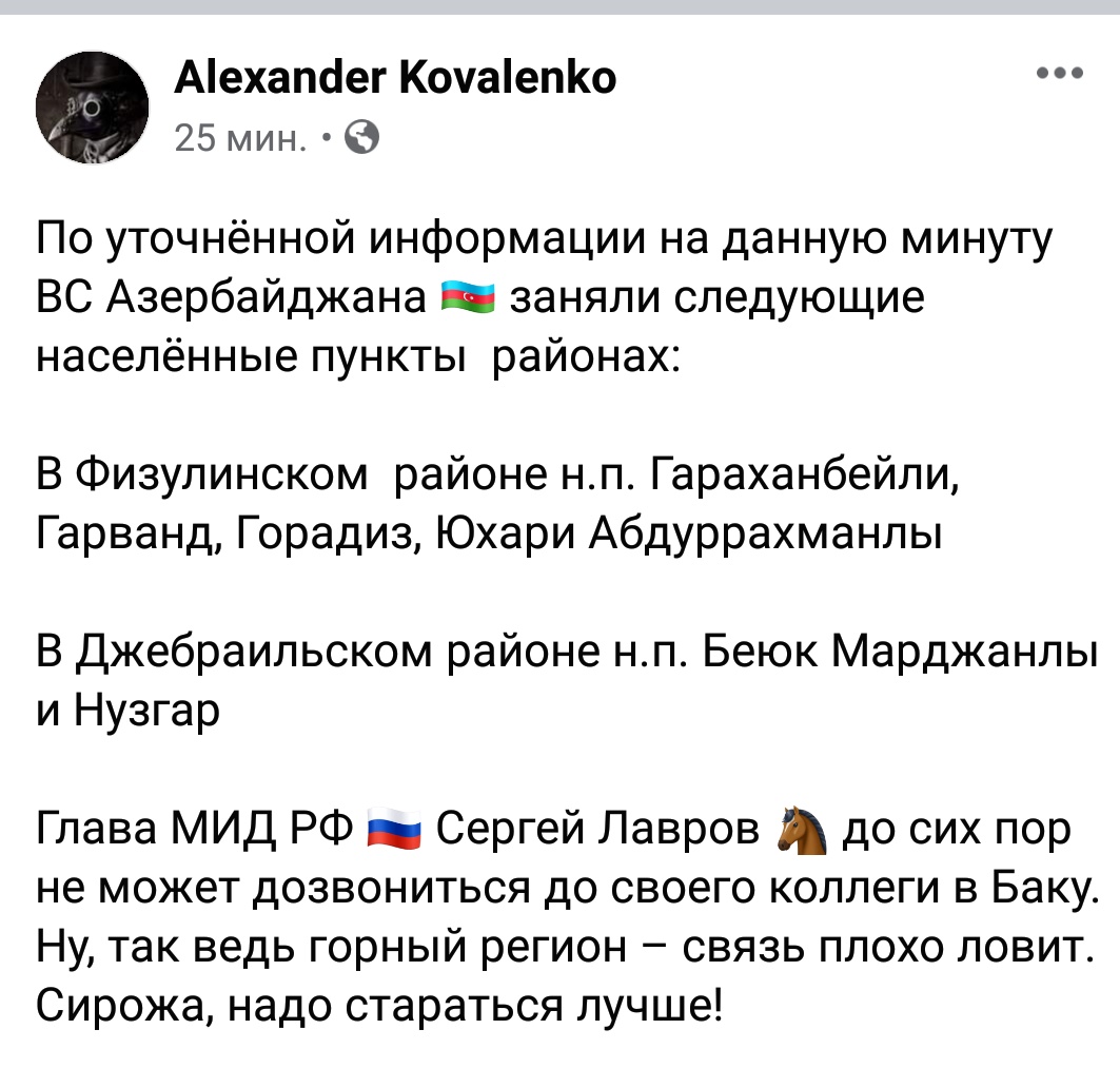 С 6.00 Азербайджан начал "молниеносную контрнаступательную операцию в прифронтовой полосе" на Тертер-Агдамском и Физули-Джебраильском направлениях против Нагорного Карабаха, обвинив Армению в вооруженном нападении и обстреле села Гапанлы Тертерского района, сел Чыраглы и Орта Гервенд Агдамского района, сел Алханлы и Шукюрбейли Физулинского района и села Джоджуг Марджанлы Джебраильского района. На текущий момент Азербайджан заявляет о потере одного вертолета и уничтожении 12 армянских ЗРК "Оса". Армяне утверждают ровно обратное, что это Азербайджан напал на Степанакерт, и заявляют об уничтожении 2 вертолетов и трех танков ВС Азербайджана.